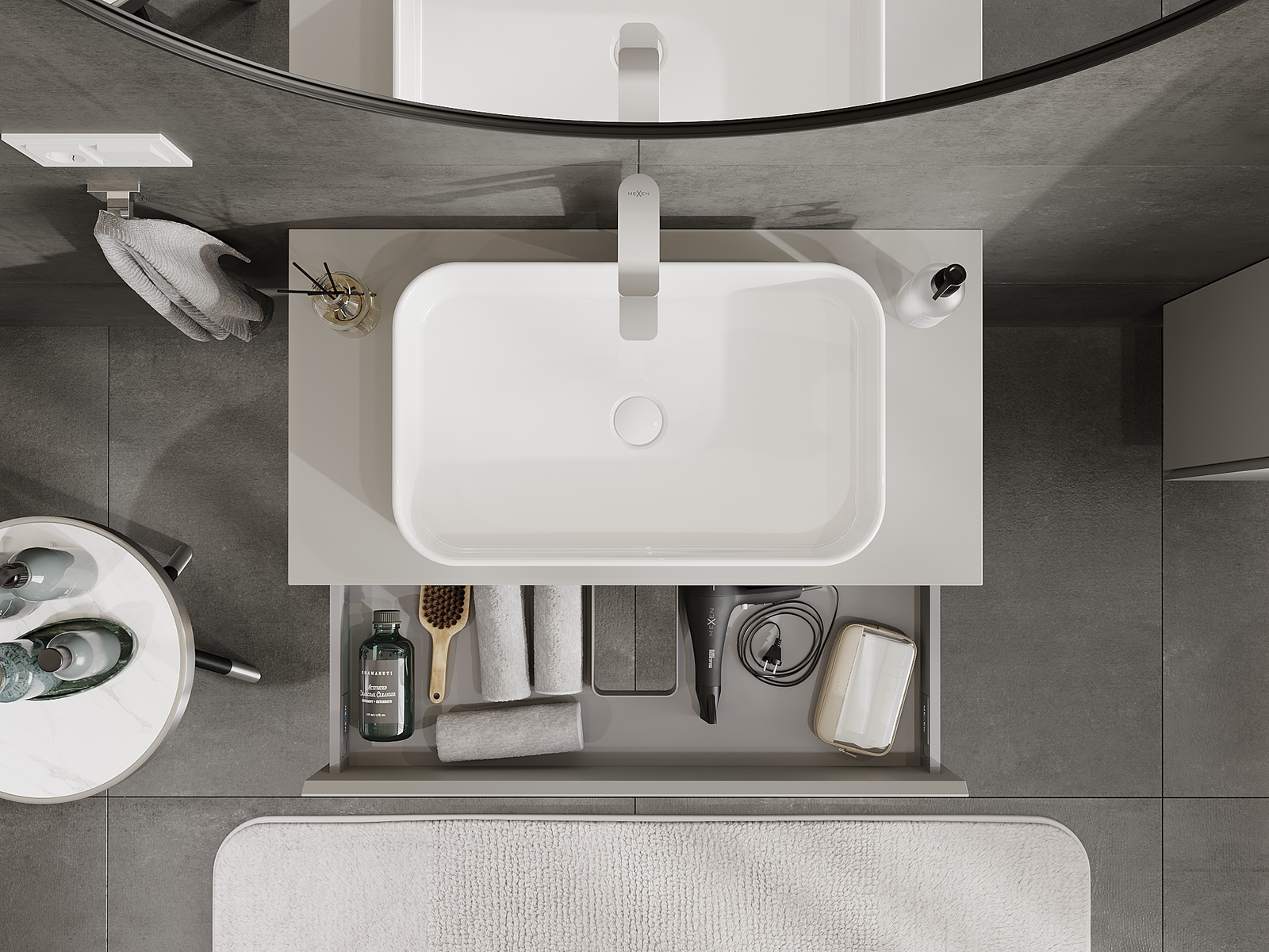 A fiókban lévő kivágás úgy van kialakítva, hogy befogadja a mosdó telepítéseknél szükséges szifont. Ennek köszönhetően a bútor teljesen funkcionálisan felszerelhető anélkül, hogy a fiók terének egy részét fel kellene áldozni a telepítés miatt.