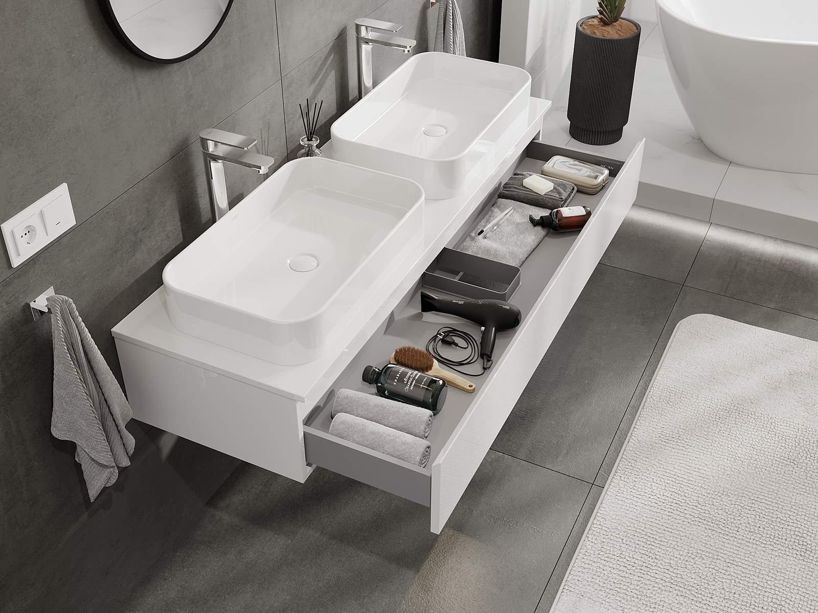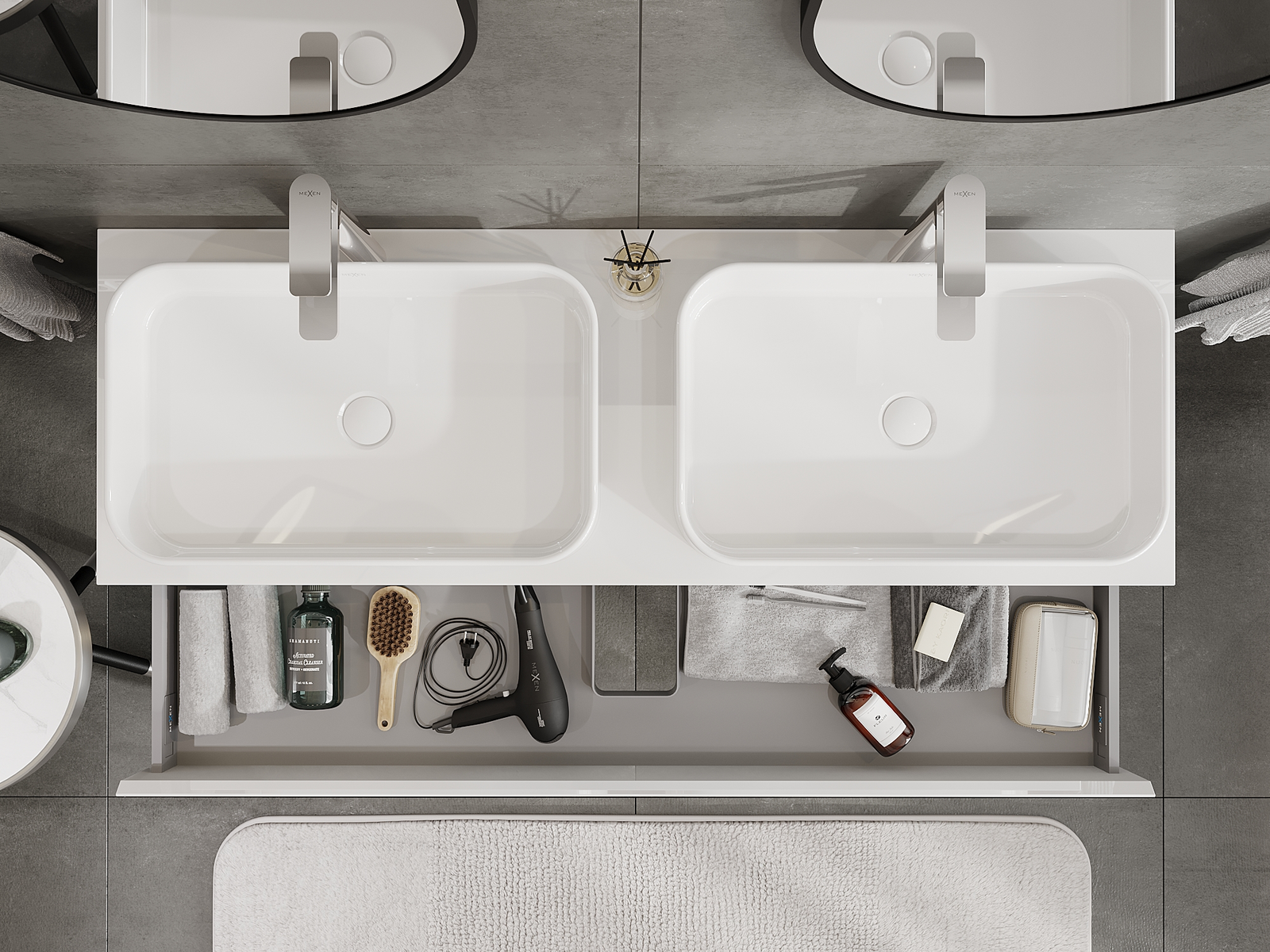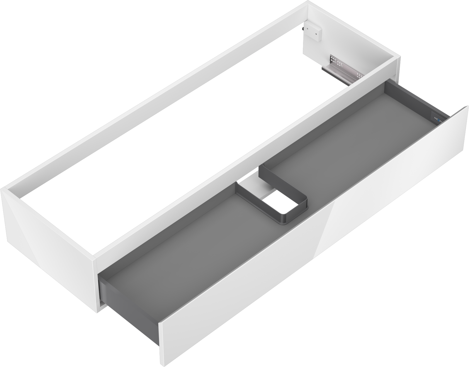 A fiókban lévő kivágás úgy van kialakítva, hogy befogadja a mosdó telepítéseknél szükséges szifont. Ennek köszönhetően a bútor teljesen funkcionálisan felszerelhető anélkül, hogy a fiók terének egy részét fel kellene áldozni a telepítés miatt.