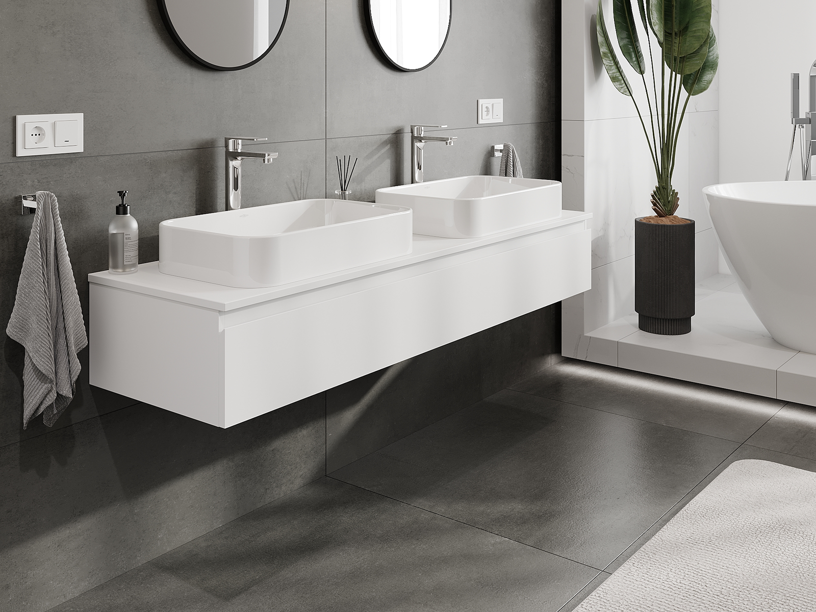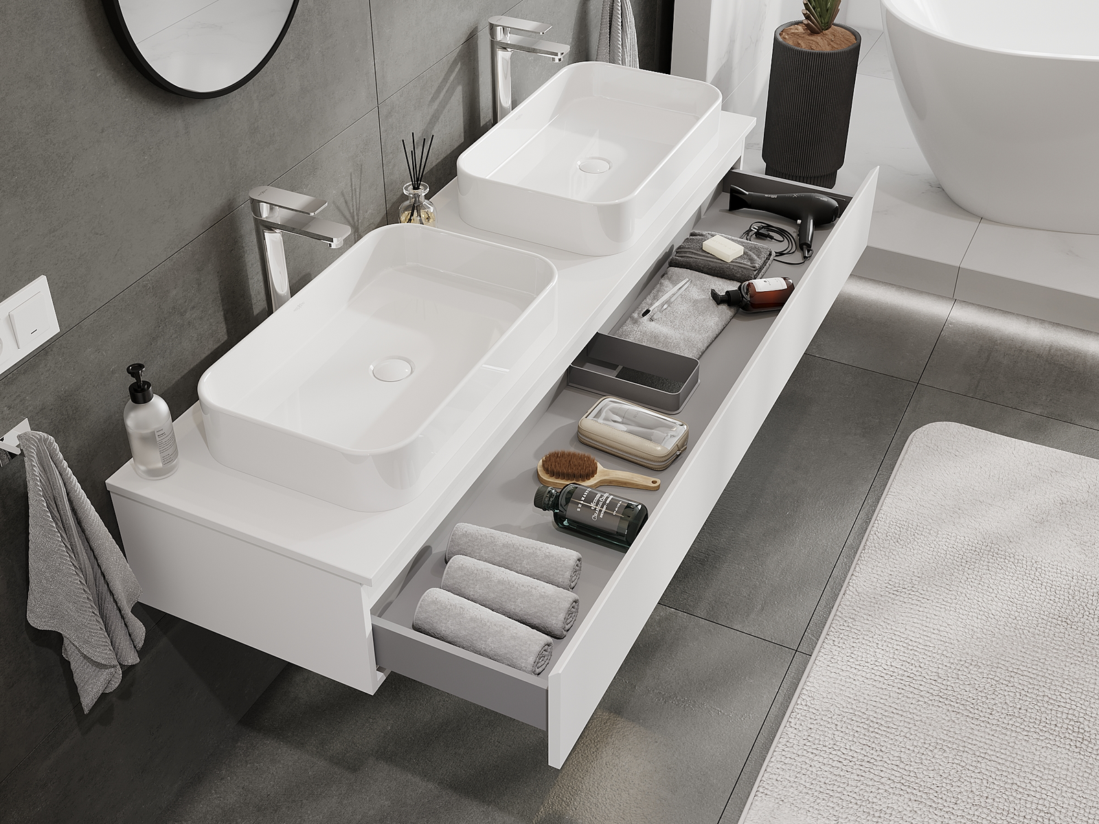 A moduláris fürdőszobabútorainkat különböző színkonfigurációkban lehet kombinálni, lehetővé téve a teljes személyre szabást. Kiválasztható mind az egyes elemek megjelenése, mind pedig funkciói, ami lehetővé teszi a bútorok személyes stílus- és használati preferenciákhoz való igazítását.