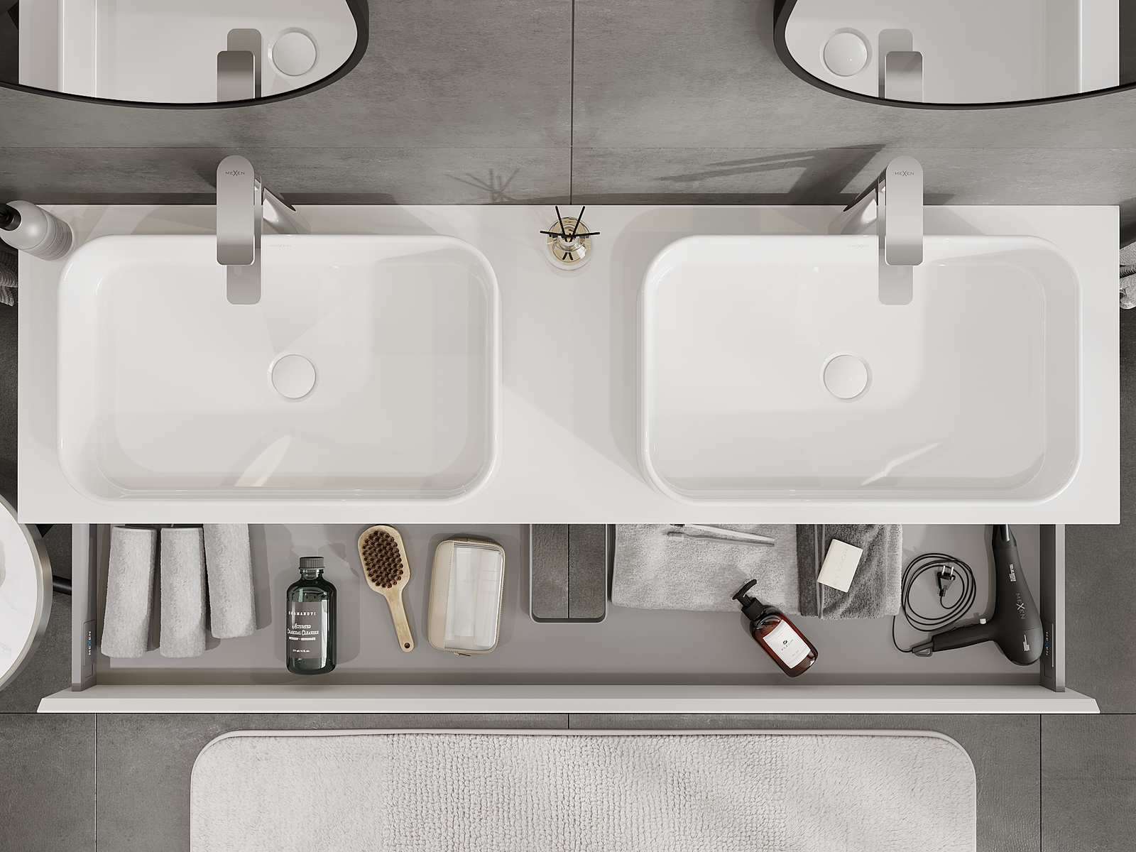 A fiókban lévő kivágás úgy van kialakítva, hogy befogadja a mosdó telepítéseknél szükséges szifont. Ennek köszönhetően a bútor teljesen funkcionálisan felszerelhető anélkül, hogy a fiók terének egy részét fel kellene áldozni a telepítés miatt.