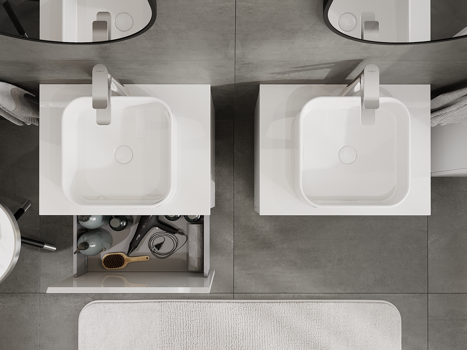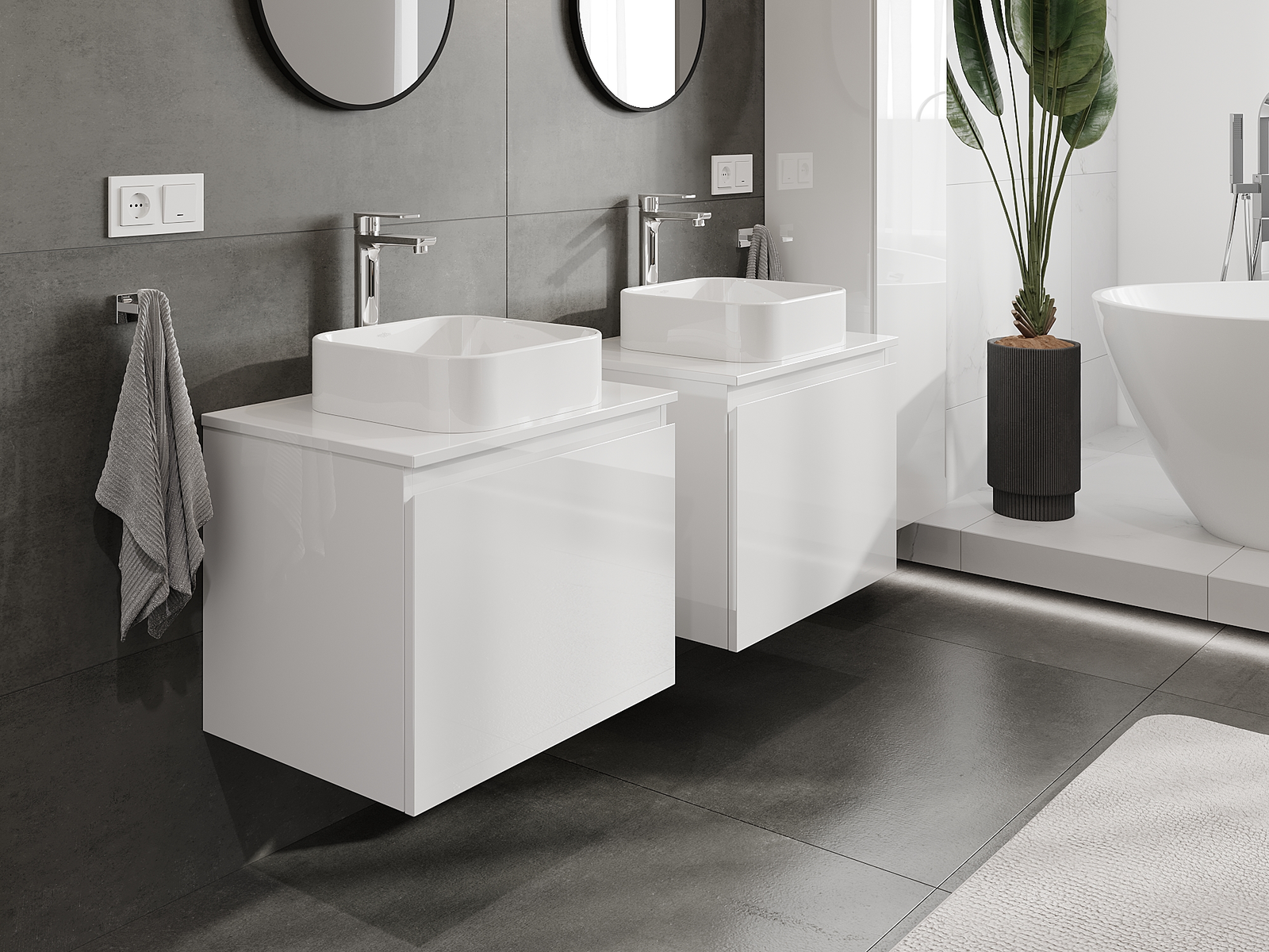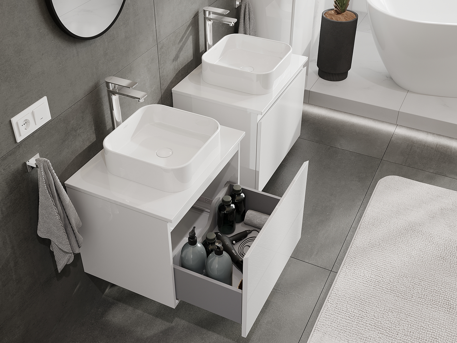 A moduláris fürdőszobabútorainkat különböző színkonfigurációkban lehet kombinálni, lehetővé téve a teljes személyre szabást. Kiválasztható mind az egyes elemek megjelenése, mind pedig funkciói, ami lehetővé teszi a bútorok személyes stílus- és használati preferenciákhoz való igazítását.
