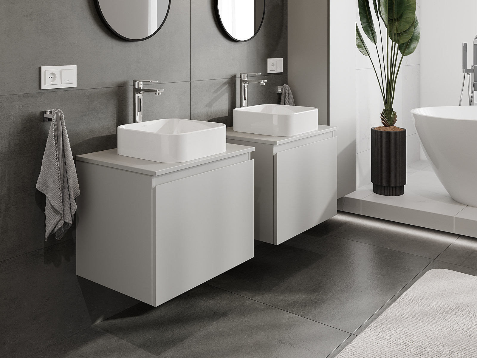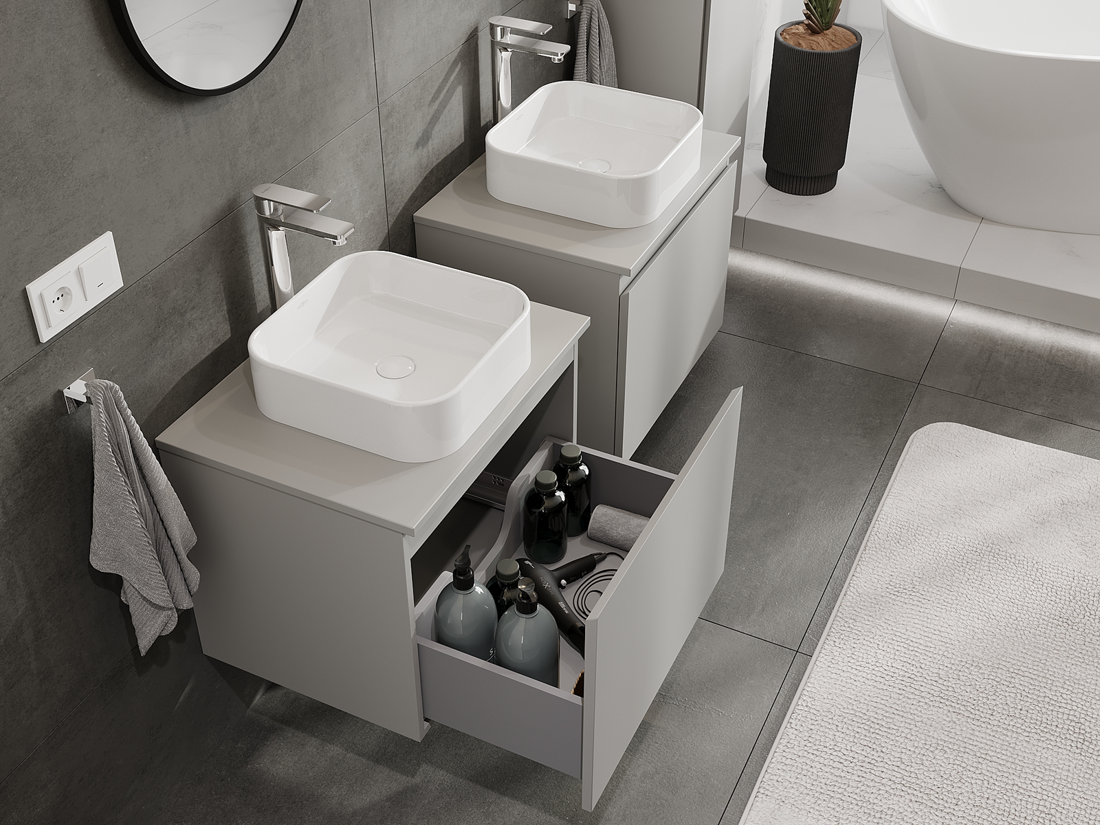 A moduláris fürdőszobabútorainkat különböző színkonfigurációkban lehet kombinálni, lehetővé téve a teljes személyre szabást. Kiválasztható mind az egyes elemek megjelenése, mind pedig funkciói, ami lehetővé teszi a bútorok személyes stílus- és használati preferenciákhoz való igazítását.