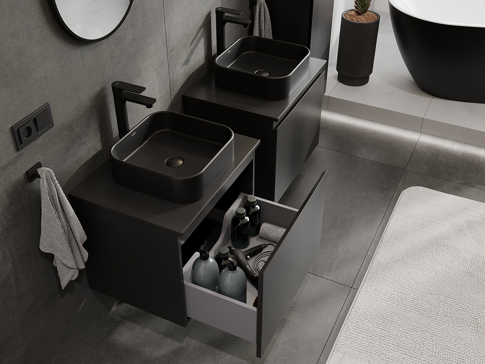 A moduláris fürdőszobabútorainkat különböző színkonfigurációkban lehet kombinálni, lehetővé téve a teljes személyre szabást. Kiválasztható mind az egyes elemek megjelenése, mind pedig funkciói, ami lehetővé teszi a bútorok személyes stílus- és használati preferenciákhoz való igazítását.