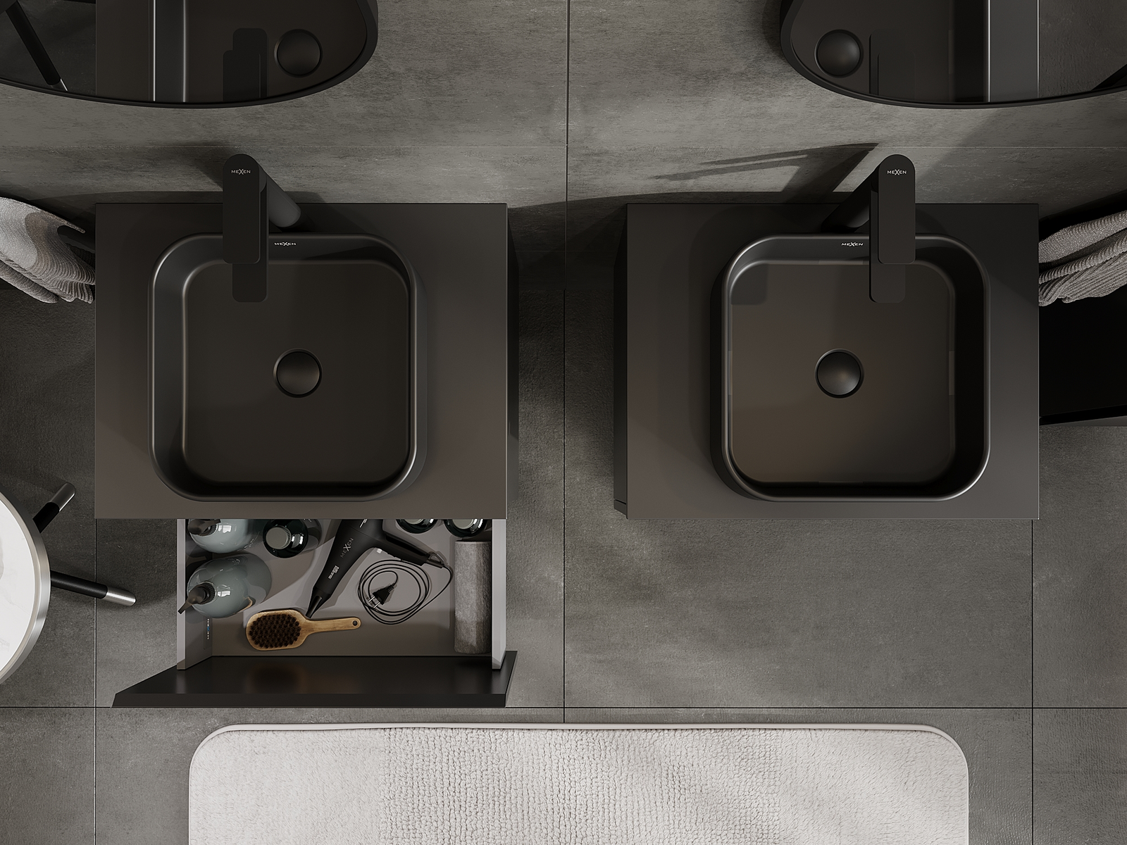 A fiókban lévő kivágás úgy van kialakítva, hogy befogadja a mosdó telepítéseknél szükséges szifont. Ennek köszönhetően a bútor teljesen funkcionálisan felszerelhető anélkül, hogy a fiók terének egy részét fel kellene áldozni a telepítés miatt.
