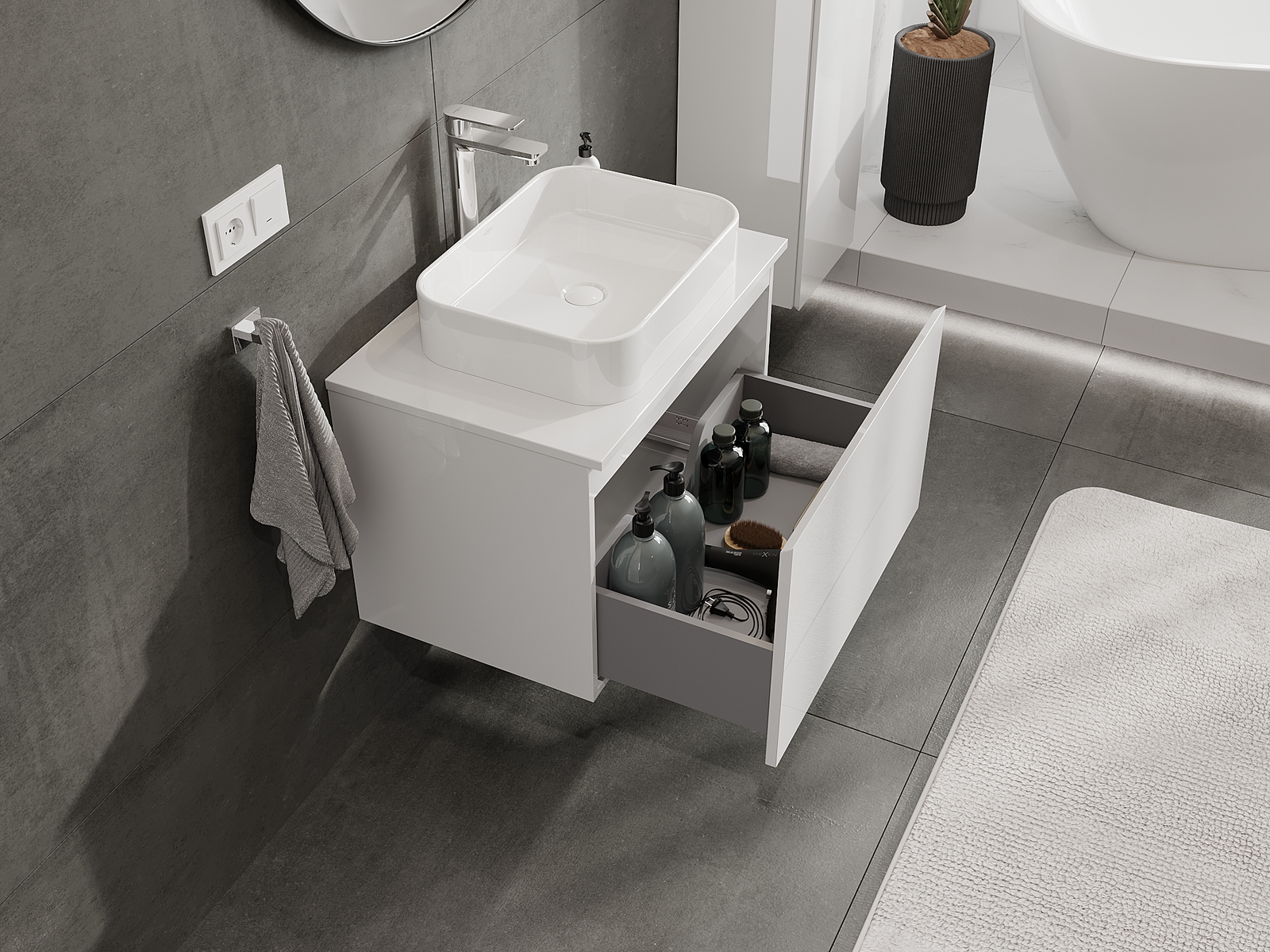 A fiókban lévő kivágás úgy van kialakítva, hogy befogadja a mosdó telepítéseknél szükséges szifont. Ennek köszönhetően a bútor teljesen funkcionálisan felszerelhető anélkül, hogy a fiók terének egy részét fel kellene áldozni a telepítés miatt.