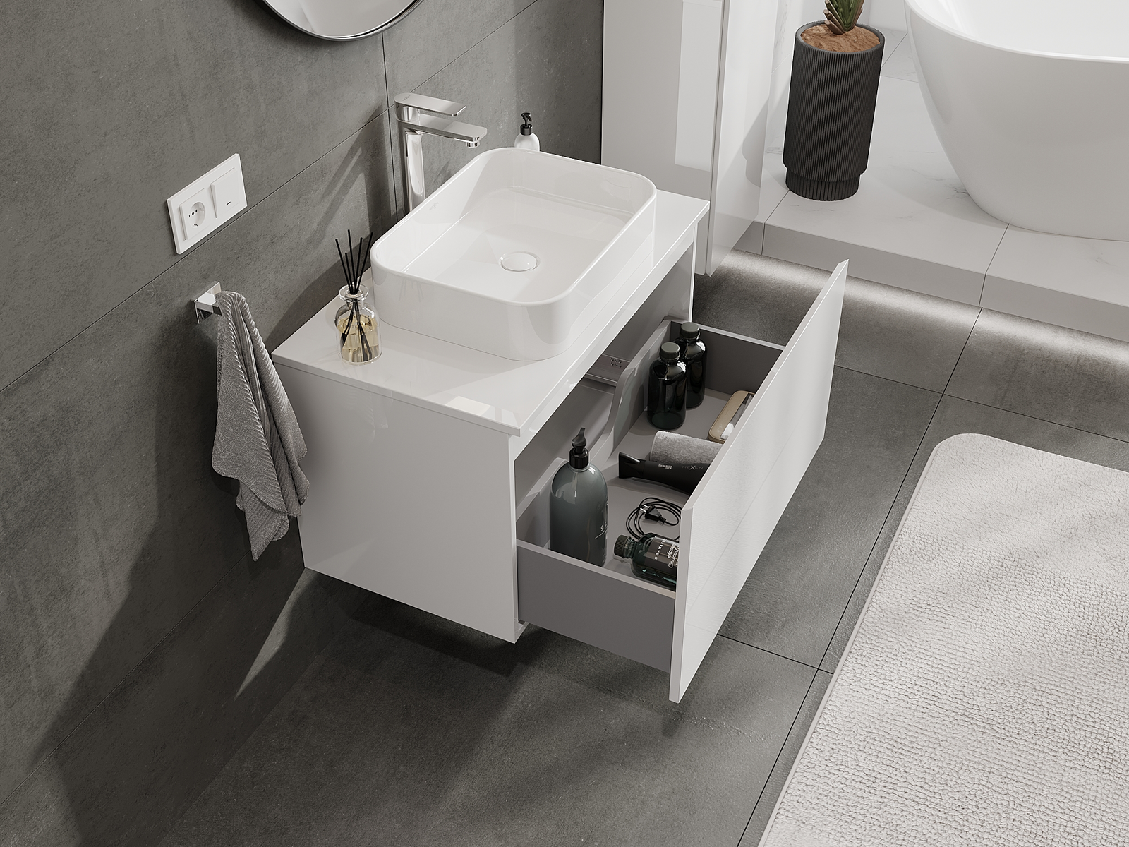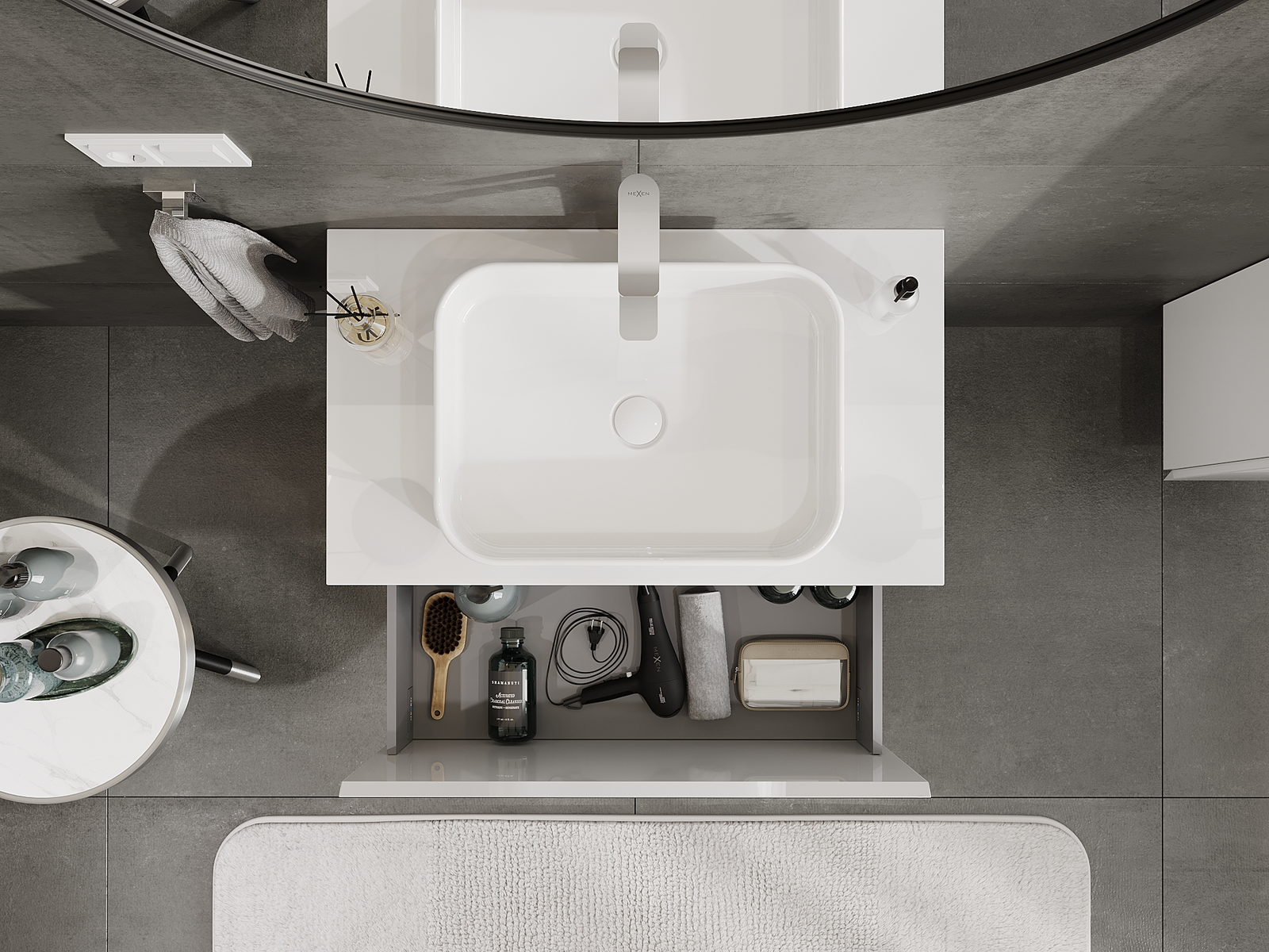 A fiókban lévő kivágás úgy van kialakítva, hogy befogadja a mosdó telepítéseknél szükséges szifont. Ennek köszönhetően a bútor teljesen funkcionálisan felszerelhető anélkül, hogy a fiók terének egy részét fel kellene áldozni a telepítés miatt.