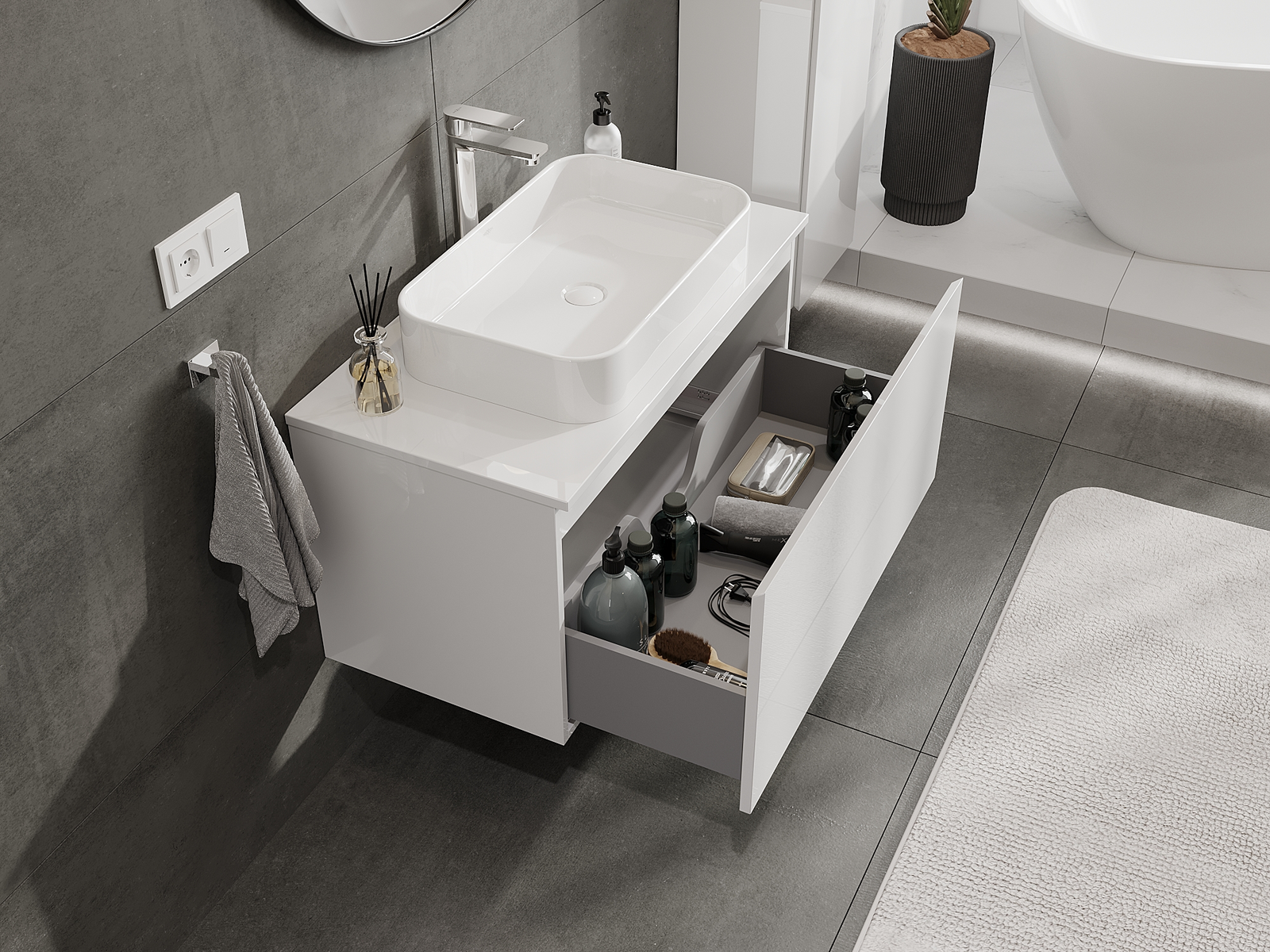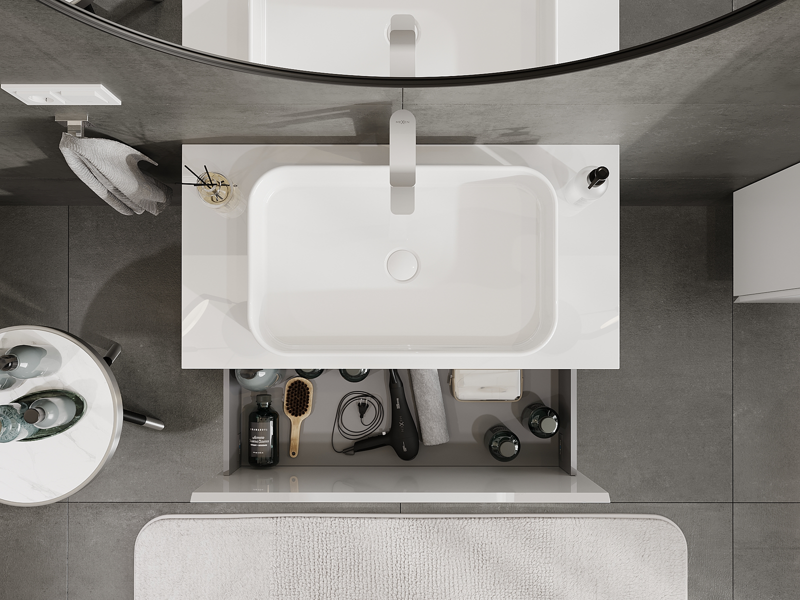 A fiókban lévő kivágás úgy van kialakítva, hogy befogadja a mosdó telepítéseknél szükséges szifont. Ennek köszönhetően a bútor teljesen funkcionálisan felszerelhető anélkül, hogy a fiók terének egy részét fel kellene áldozni a telepítés miatt.