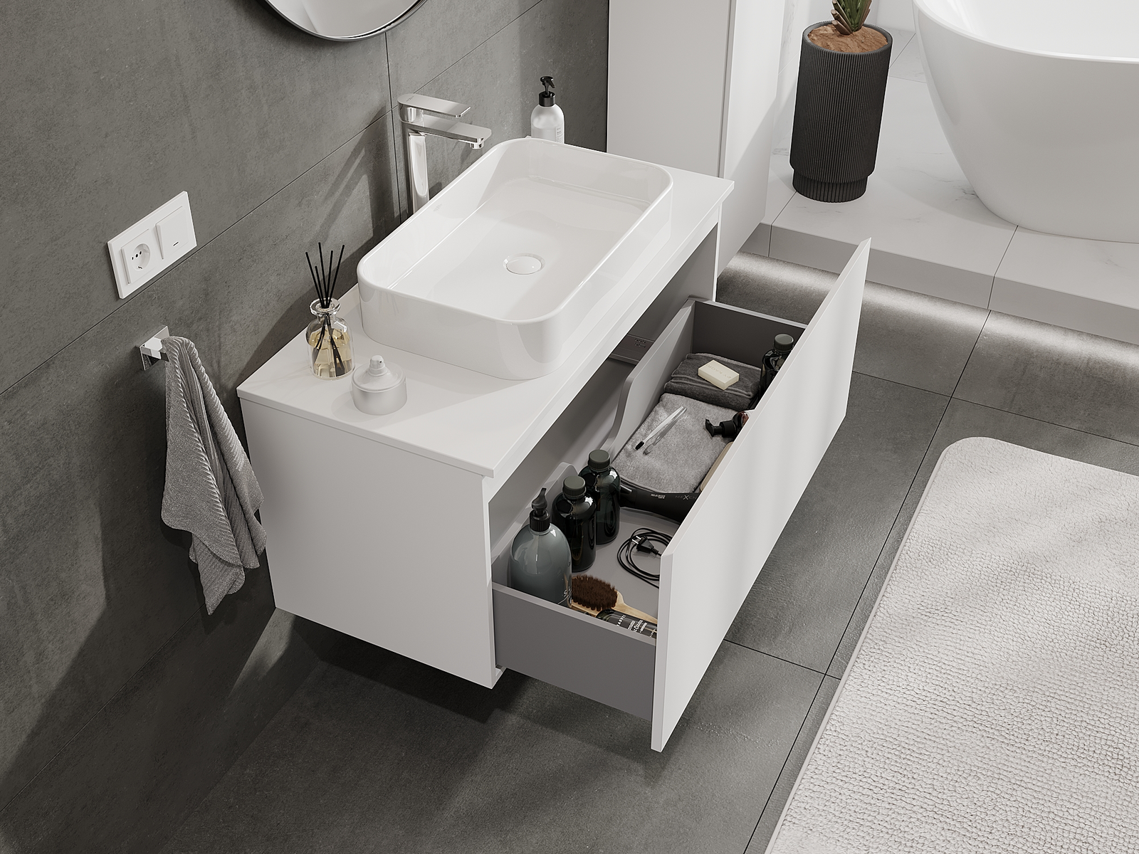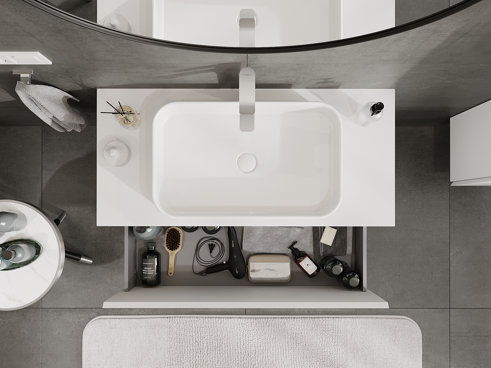 A fiókban lévő kivágás úgy van kialakítva, hogy befogadja a mosdó telepítéseknél szükséges szifont. Ennek köszönhetően a bútor teljesen funkcionálisan felszerelhető anélkül, hogy a fiók terének egy részét fel kellene áldozni a telepítés miatt.