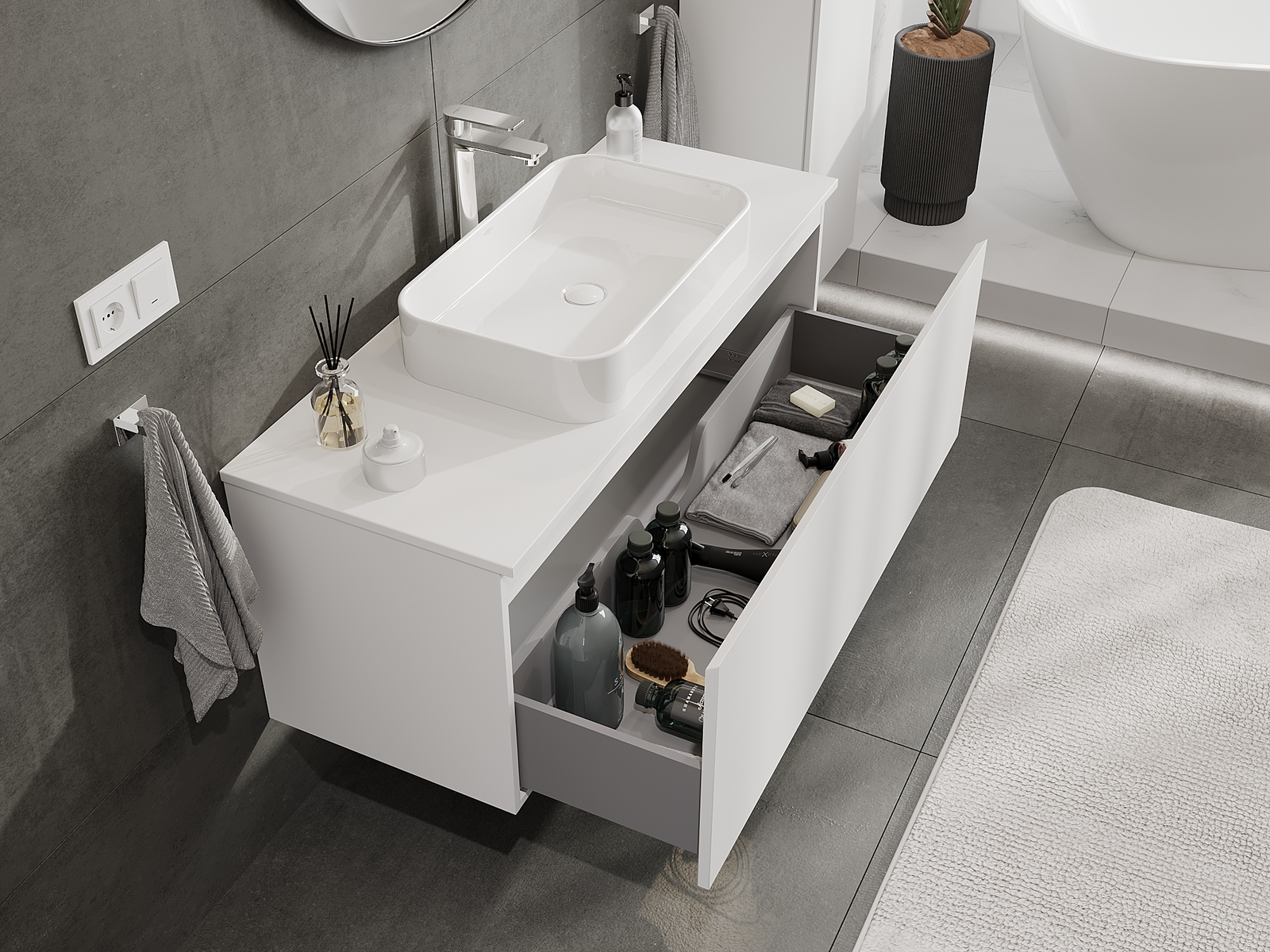 A fiókban lévő kivágás úgy van kialakítva, hogy befogadja a mosdó telepítéseknél szükséges szifont. Ennek köszönhetően a bútor teljesen funkcionálisan felszerelhető anélkül, hogy a fiók terének egy részét fel kellene áldozni a telepítés miatt.