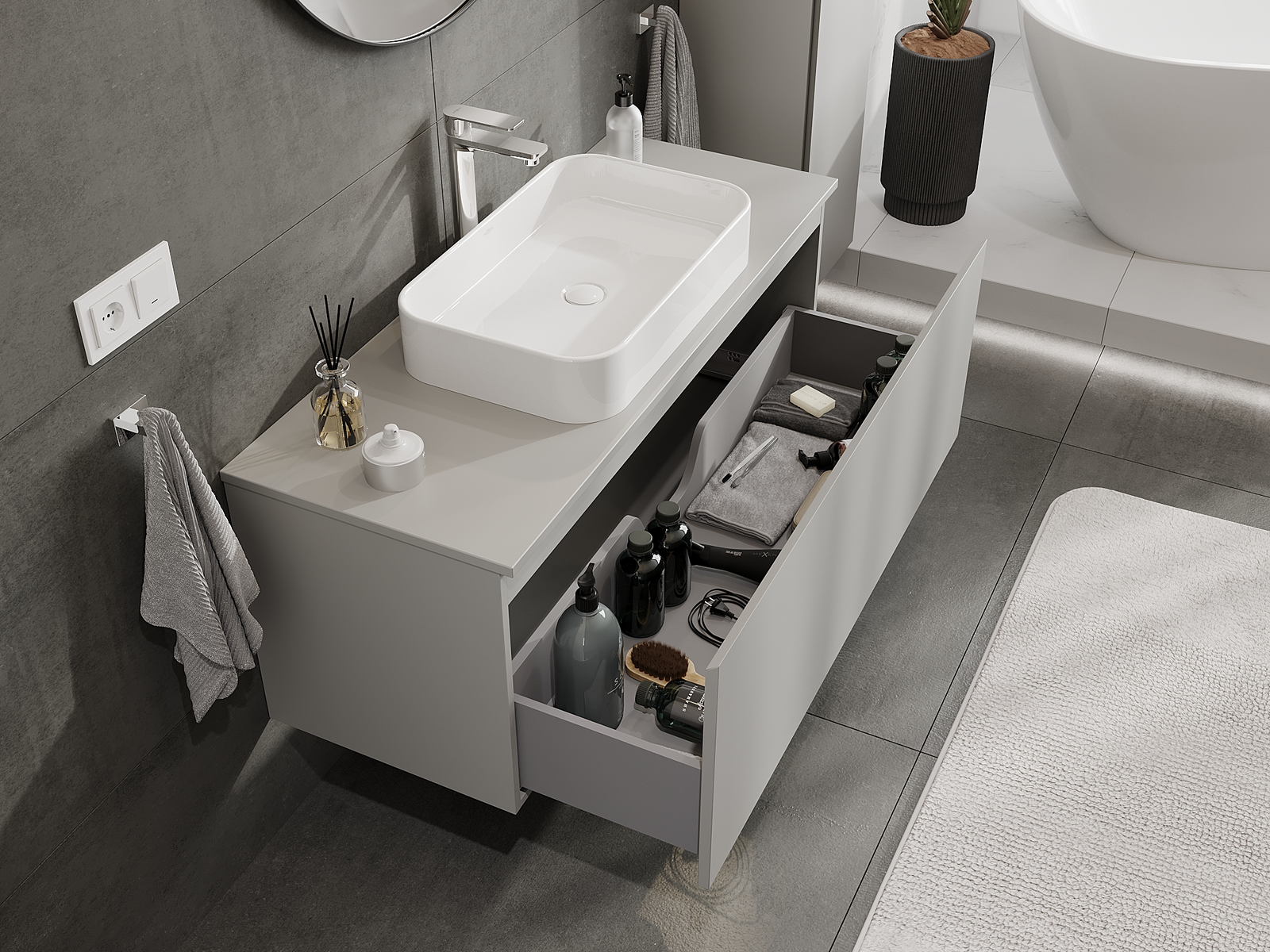 A moduláris fürdőszobabútorainkat különböző színkonfigurációkban lehet kombinálni, lehetővé téve a teljes személyre szabást. Kiválasztható mind az egyes elemek megjelenése, mind pedig funkciói, ami lehetővé teszi a bútorok személyes stílus- és használati preferenciákhoz való igazítását.