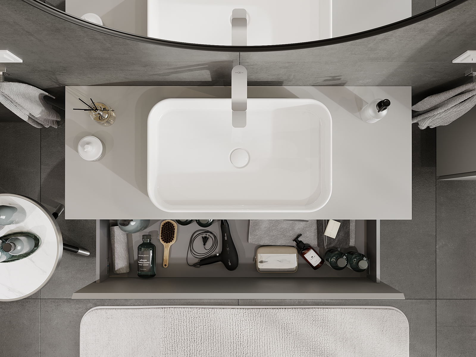 A fiókban lévő kivágás úgy van kialakítva, hogy befogadja a mosdó telepítéseknél szükséges szifont. Ennek köszönhetően a bútor teljesen funkcionálisan felszerelhető anélkül, hogy a fiók terének egy részét fel kellene áldozni a telepítés miatt.