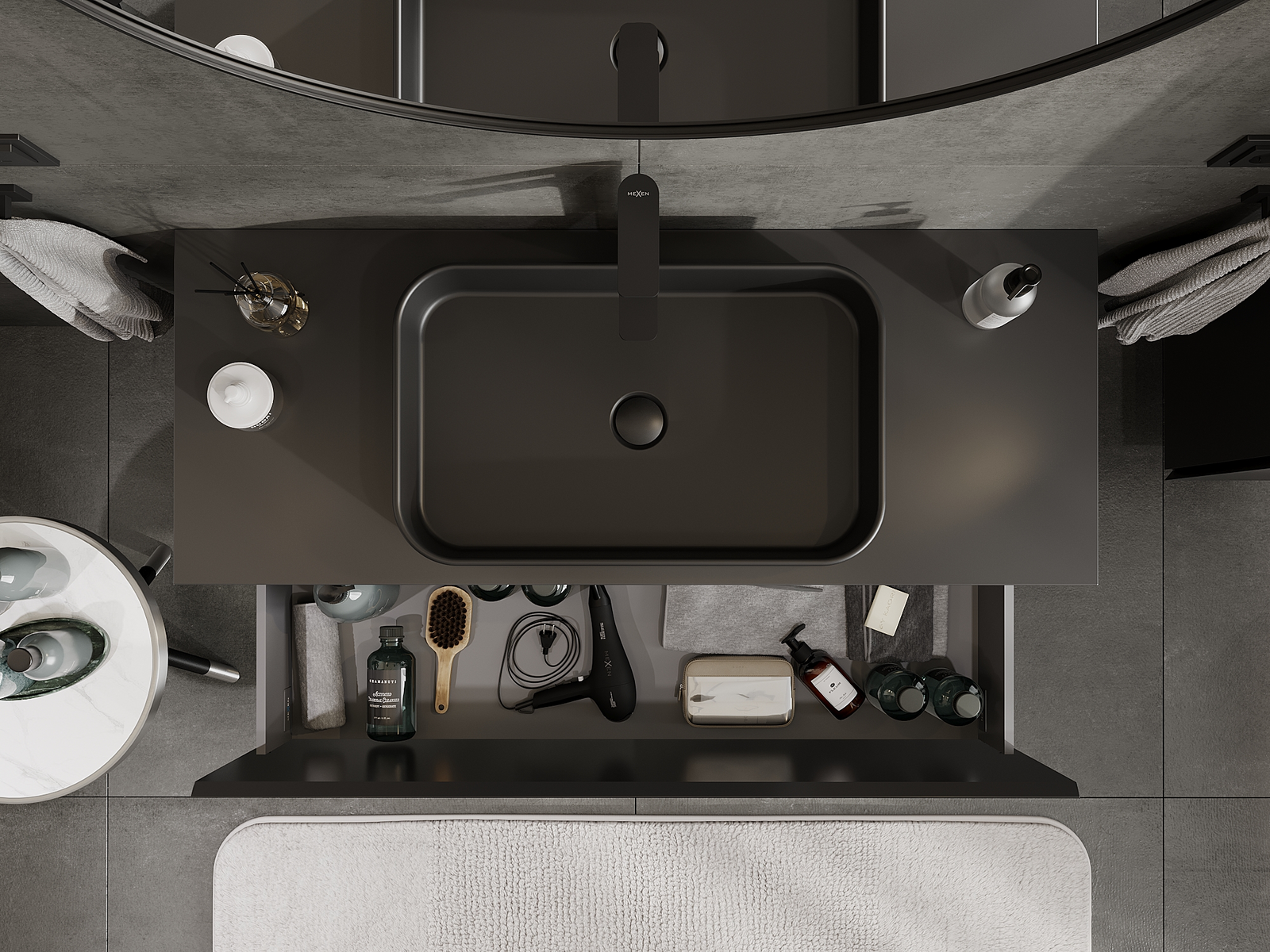 A fiókban lévő kivágás úgy van kialakítva, hogy befogadja a mosdó telepítéseknél szükséges szifont. Ennek köszönhetően a bútor teljesen funkcionálisan felszerelhető anélkül, hogy a fiók terének egy részét fel kellene áldozni a telepítés miatt.