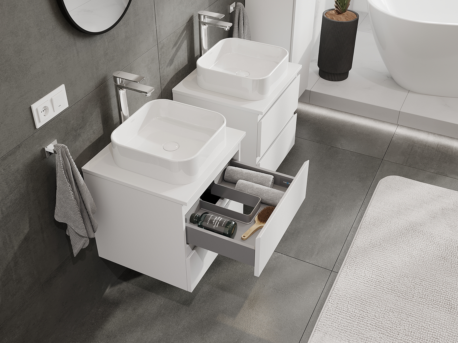 A moduláris fürdőszobabútorainkat különböző színkonfigurációkban lehet kombinálni, lehetővé téve a teljes személyre szabást. Kiválasztható mind az egyes elemek megjelenése, mind pedig funkciói, ami lehetővé teszi a bútorok személyes stílus- és használati preferenciákhoz való igazítását.