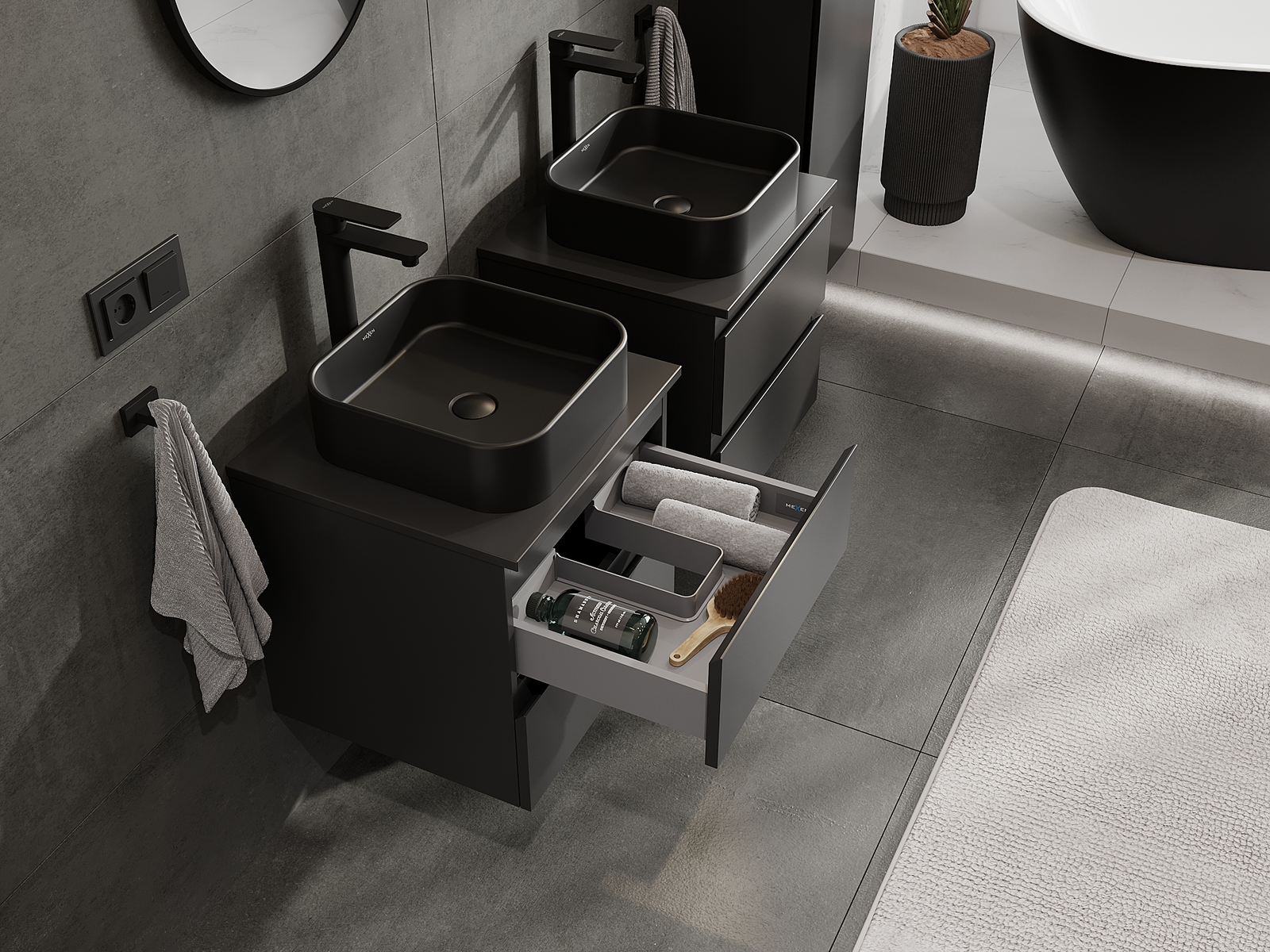 A fiókban lévő kivágás úgy van kialakítva, hogy befogadja a mosdó telepítéseknél szükséges szifont. Ennek köszönhetően a bútor teljesen funkcionálisan felszerelhető anélkül, hogy a fiók terének egy részét fel kellene áldozni a telepítés miatt.