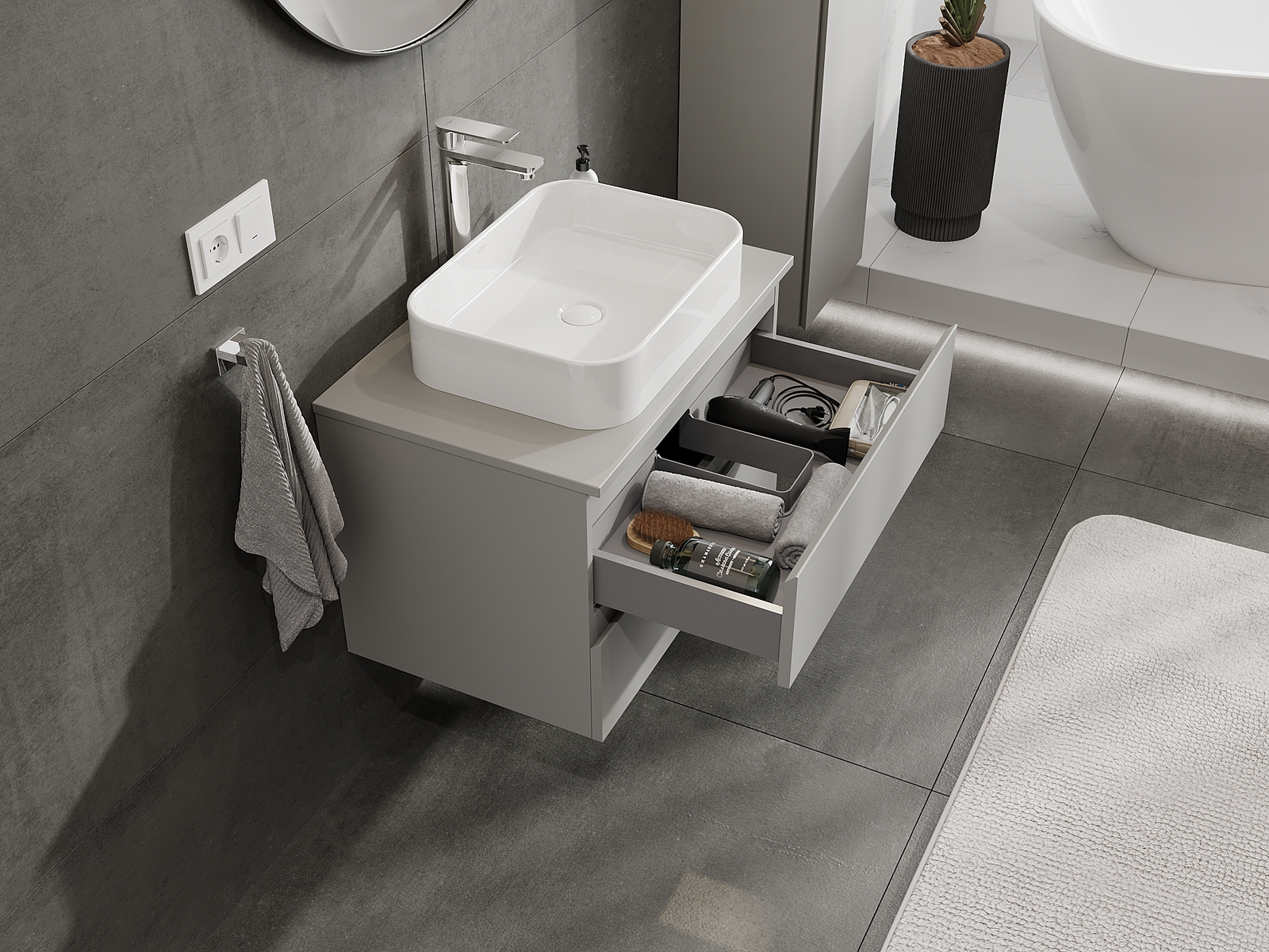 A fiókban lévő kivágás úgy van kialakítva, hogy befogadja a mosdó telepítéseknél szükséges szifont. Ennek köszönhetően a bútor teljesen funkcionálisan felszerelhető anélkül, hogy a fiók terének egy részét fel kellene áldozni a telepítés miatt.
