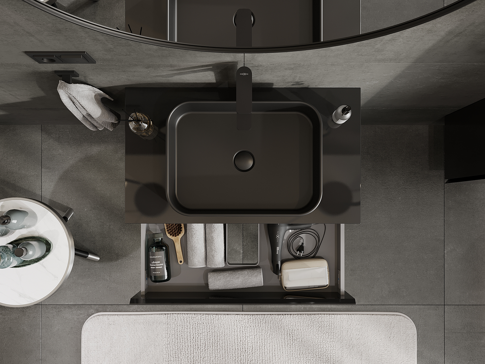 A fiókban lévő kivágás úgy van kialakítva, hogy befogadja a mosdó telepítéseknél szükséges szifont. Ennek köszönhetően a bútor teljesen funkcionálisan felszerelhető anélkül, hogy a fiók terének egy részét fel kellene áldozni a telepítés miatt.