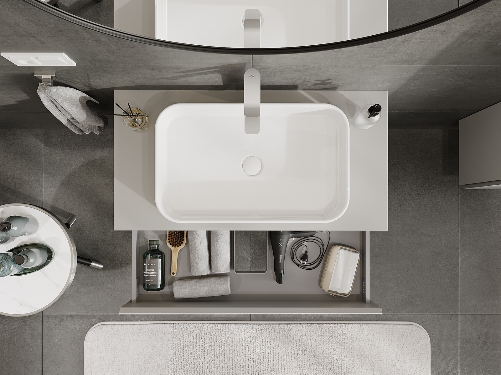 A fiókban lévő kivágás úgy van kialakítva, hogy befogadja a mosdó telepítéseknél szükséges szifont. Ennek köszönhetően a bútor teljesen funkcionálisan felszerelhető anélkül, hogy a fiók terének egy részét fel kellene áldozni a telepítés miatt.