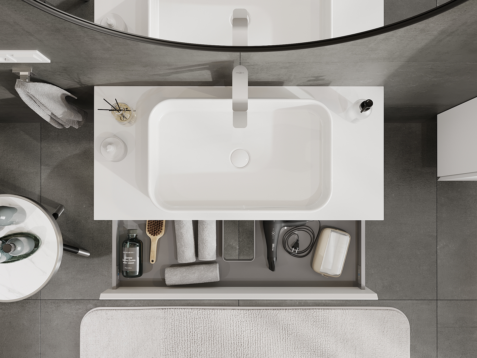 A fiókban lévő kivágás úgy van kialakítva, hogy befogadja a mosdó telepítéseknél szükséges szifont. Ennek köszönhetően a bútor teljesen funkcionálisan felszerelhető anélkül, hogy a fiók terének egy részét fel kellene áldozni a telepítés miatt.
