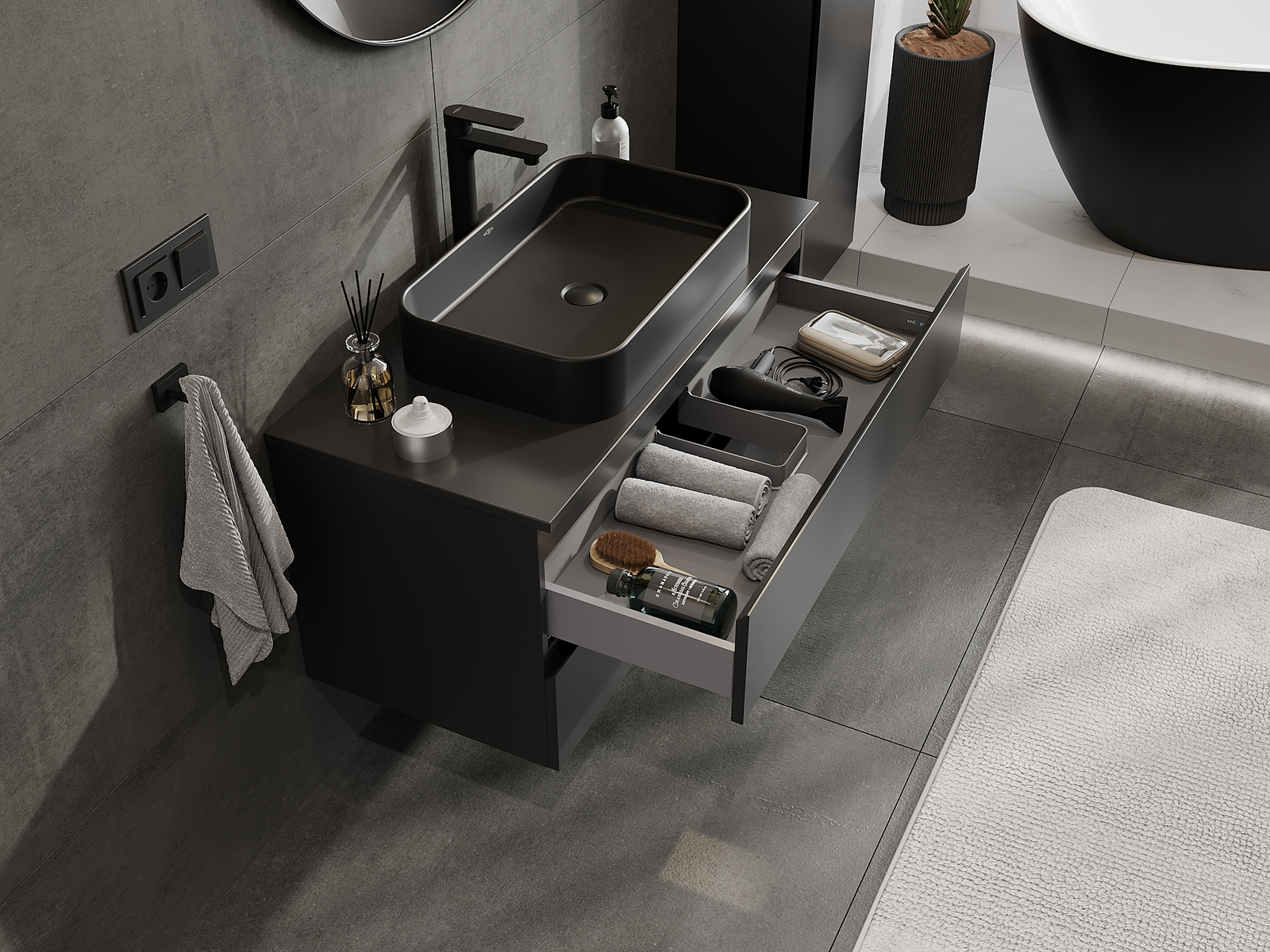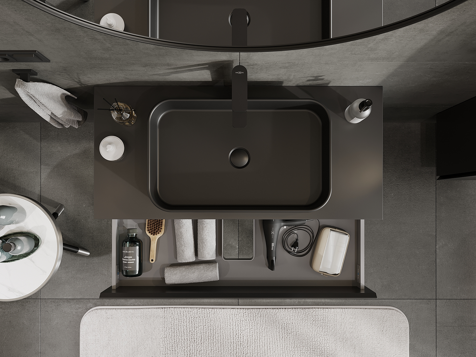 A fiókban lévő kivágás úgy van kialakítva, hogy befogadja a mosdó telepítéseknél szükséges szifont. Ennek köszönhetően a bútor teljesen funkcionálisan felszerelhető anélkül, hogy a fiók terének egy részét fel kellene áldozni a telepítés miatt.