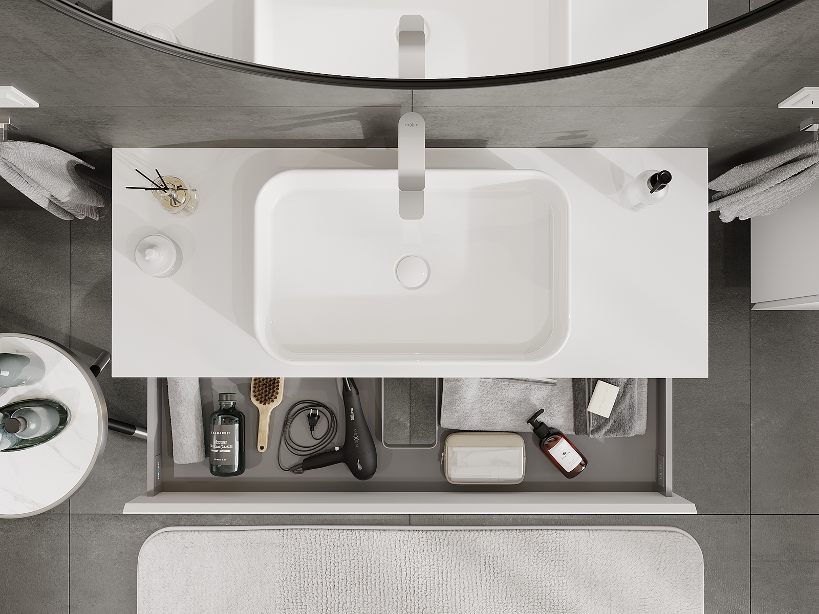 A fiókban lévő kivágás úgy van kialakítva, hogy befogadja a mosdó telepítéseknél szükséges szifont. Ennek köszönhetően a bútor teljesen funkcionálisan felszerelhető anélkül, hogy a fiók terének egy részét fel kellene áldozni a telepítés miatt.