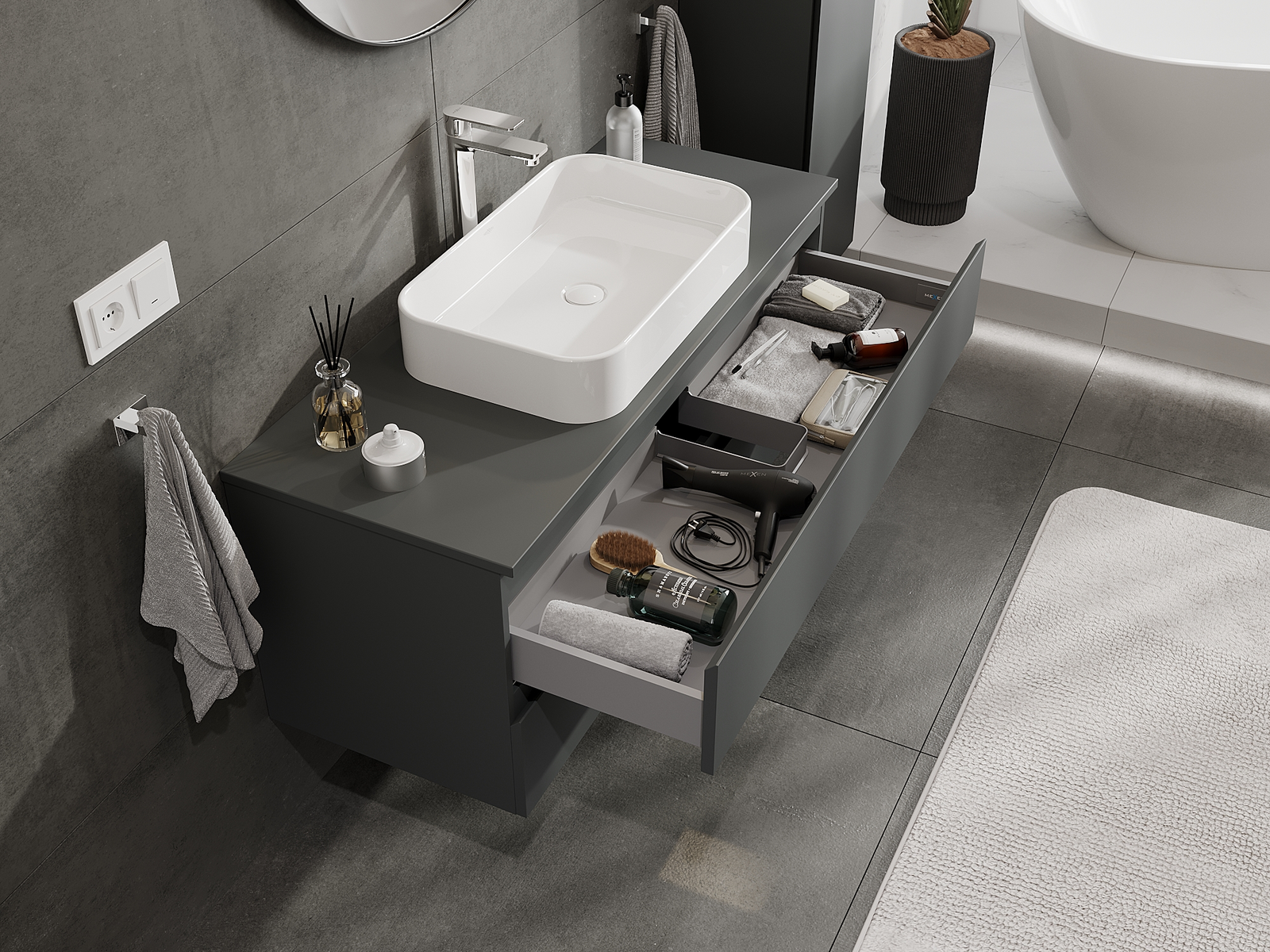 A fiókban lévő kivágás úgy van kialakítva, hogy befogadja a mosdó telepítéseknél szükséges szifont. Ennek köszönhetően a bútor teljesen funkcionálisan felszerelhető anélkül, hogy a fiók terének egy részét fel kellene áldozni a telepítés miatt.
