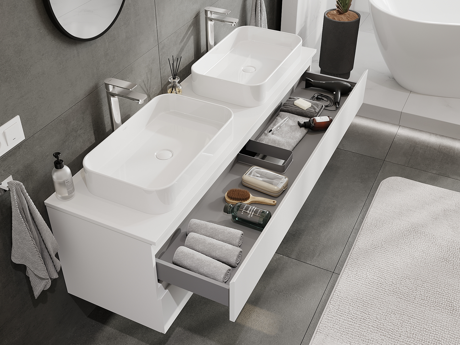 A fiókban lévő kivágás úgy van kialakítva, hogy befogadja a mosdó telepítéseknél szükséges szifont. Ennek köszönhetően a bútor teljesen funkcionálisan felszerelhető anélkül, hogy a fiók terének egy részét fel kellene áldozni a telepítés miatt.