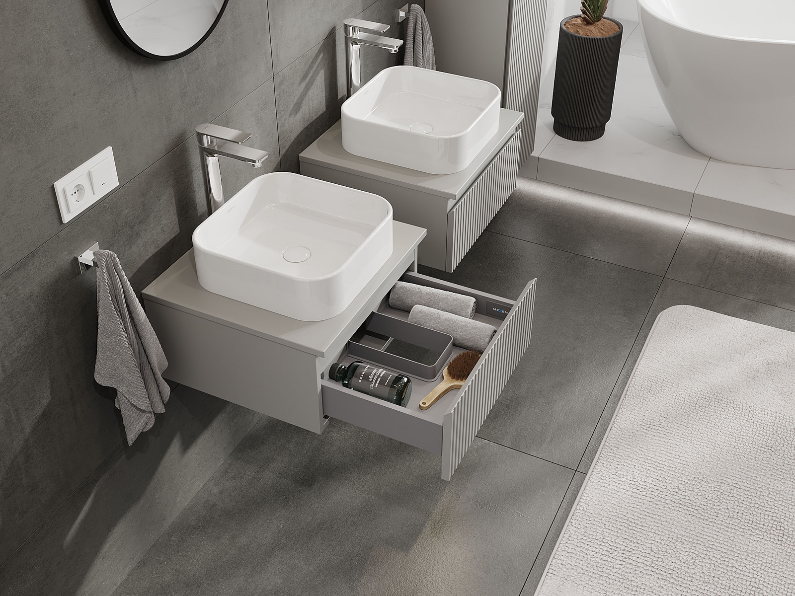 A fiókban lévő kivágás úgy van kialakítva, hogy befogadja a mosdó telepítéseknél szükséges szifont. Ennek köszönhetően a bútor teljesen funkcionálisan felszerelhető anélkül, hogy a fiók terének egy részét fel kellene áldozni a telepítés miatt.