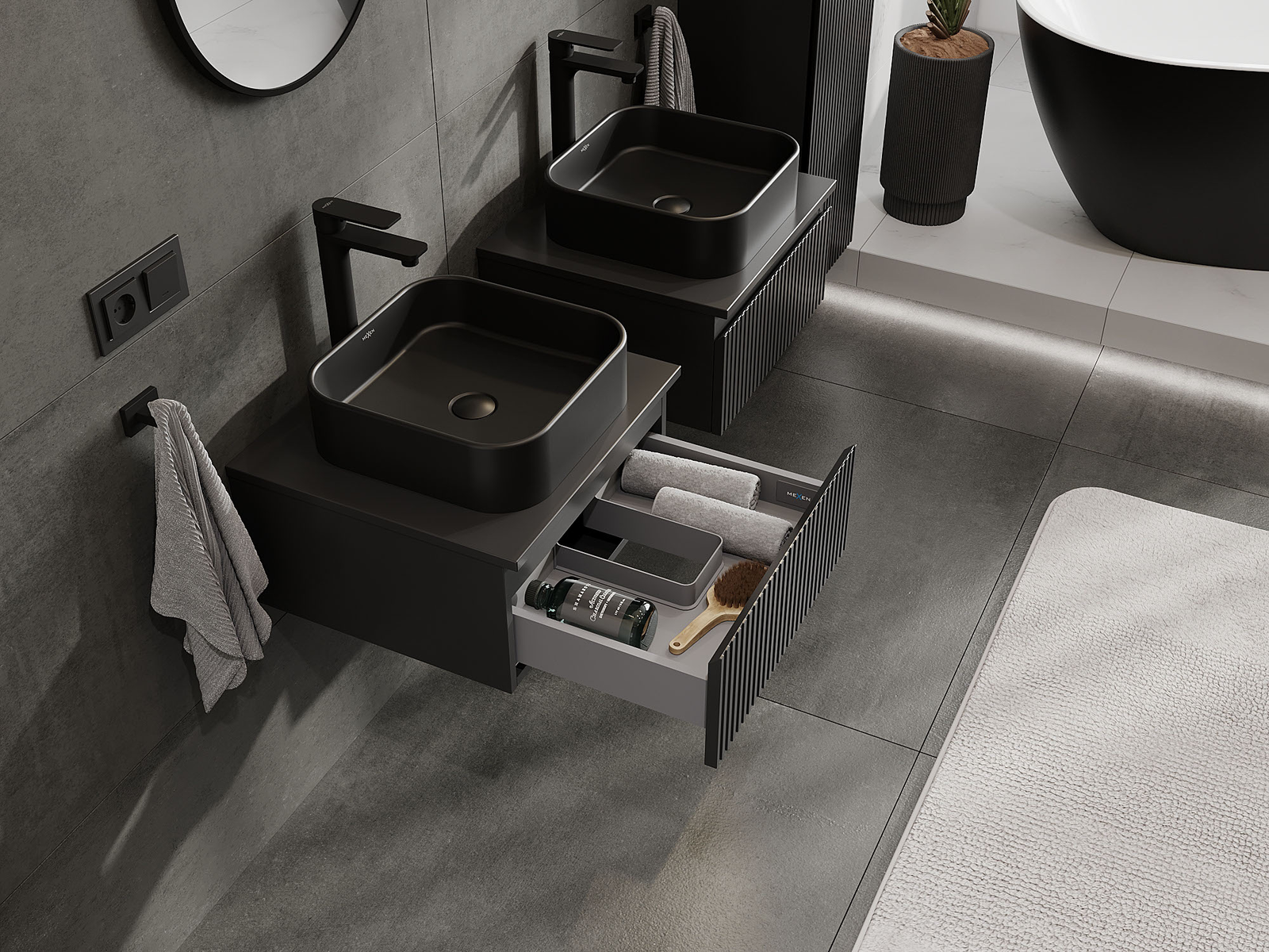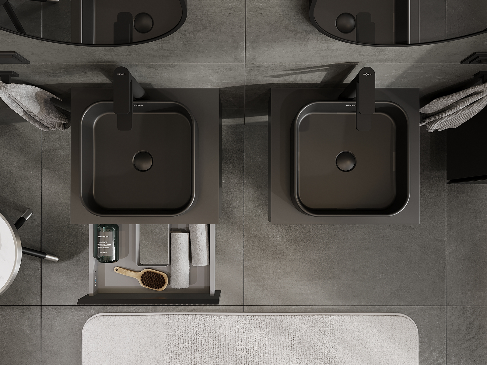 A fiókban lévő kivágás úgy van kialakítva, hogy befogadja a mosdó telepítéseknél szükséges szifont. Ennek köszönhetően a bútor teljesen funkcionálisan felszerelhető anélkül, hogy a fiók terének egy részét fel kellene áldozni a telepítés miatt.