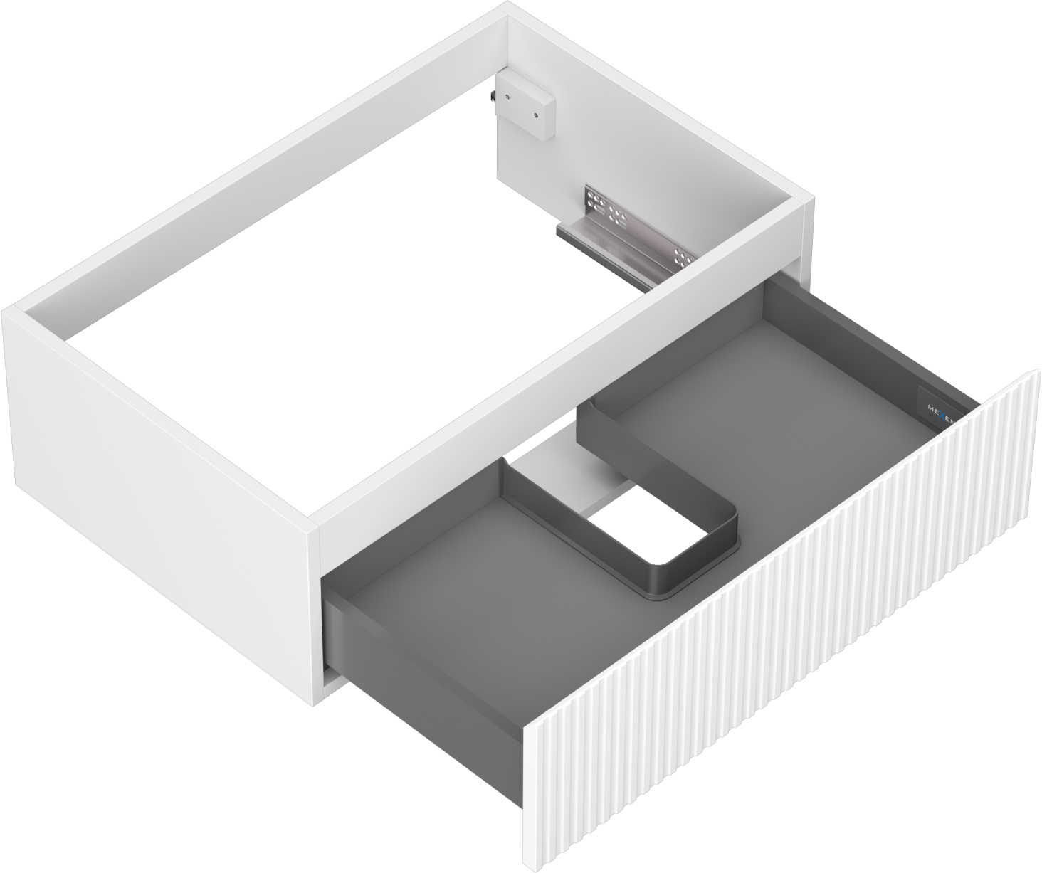 A fiókban lévő kivágás úgy van kialakítva, hogy befogadja a mosdó telepítéseknél szükséges szifont. Ennek köszönhetően a bútor teljesen funkcionálisan felszerelhető anélkül, hogy a fiók terének egy részét fel kellene áldozni a telepítés miatt.
