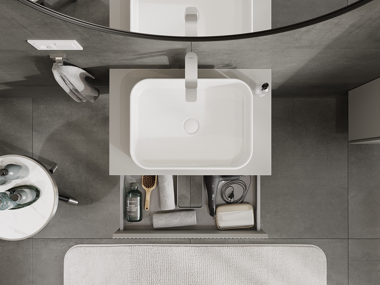 A fiókban lévő kivágás úgy van kialakítva, hogy befogadja a mosdó telepítéseknél szükséges szifont. Ennek köszönhetően a bútor teljesen funkcionálisan felszerelhető anélkül, hogy a fiók terének egy részét fel kellene áldozni a telepítés miatt.