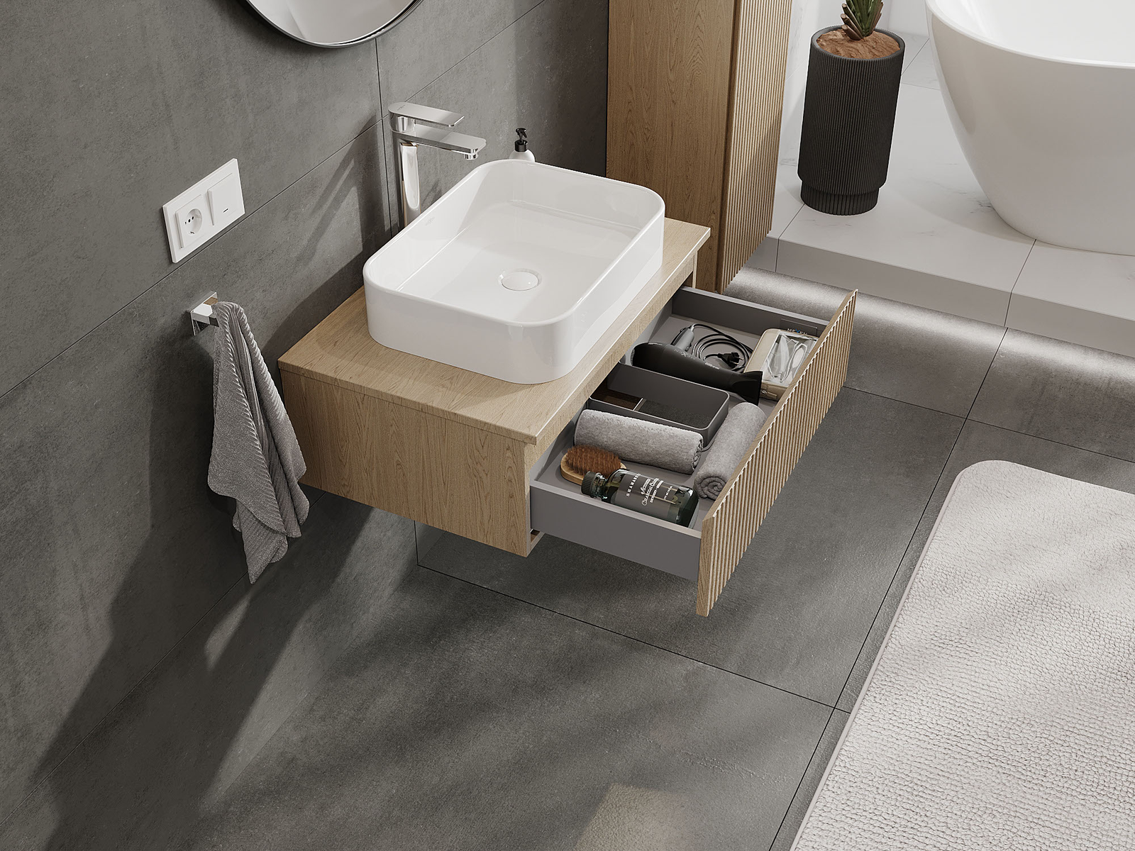 A fiókban lévő kivágás úgy van kialakítva, hogy befogadja a mosdó telepítéseknél szükséges szifont. Ennek köszönhetően a bútor teljesen funkcionálisan felszerelhető anélkül, hogy a fiók terének egy részét fel kellene áldozni a telepítés miatt.