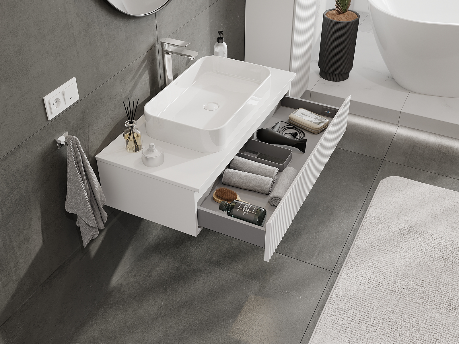 Mexen Rivel fürdőszobai szekrény mosdó alá 100 cm, 1 fiók, barázdált, matt fehér - 91A20-10023-1-BF01