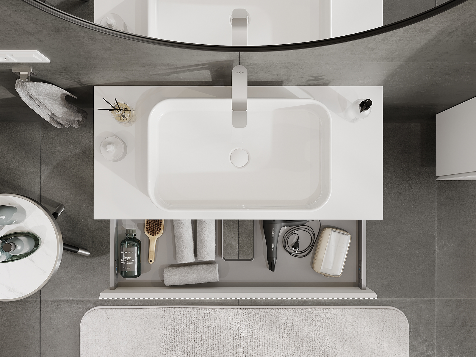 A fiókban lévő kivágás úgy van kialakítva, hogy befogadja a mosdó telepítéseknél szükséges szifont. Ennek köszönhetően a bútor teljesen funkcionálisan felszerelhető anélkül, hogy a fiók terének egy részét fel kellene áldozni a telepítés miatt.