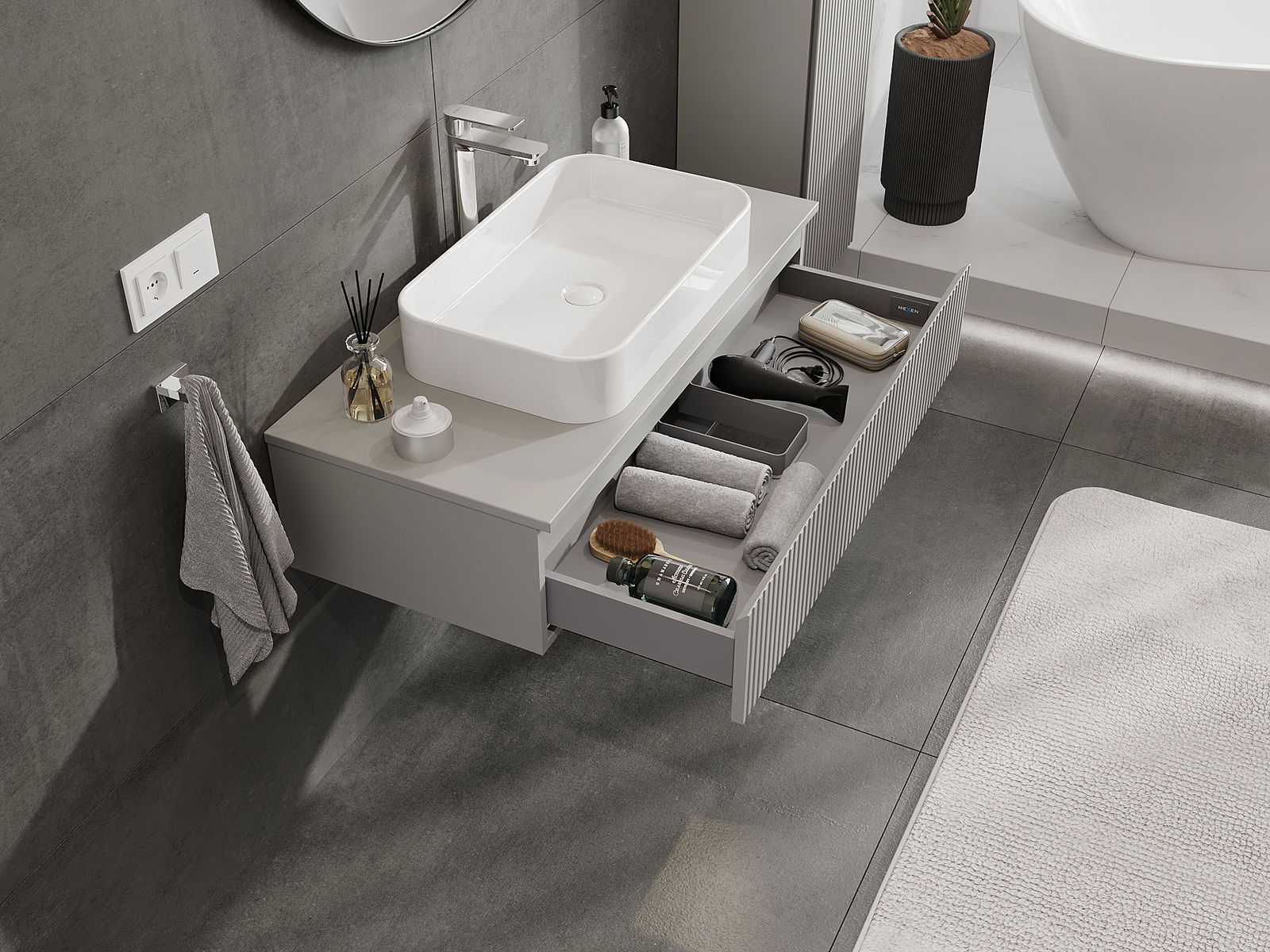 A fiókban lévő kivágás úgy van kialakítva, hogy befogadja a mosdó telepítéseknél szükséges szifont. Ennek köszönhetően a bútor teljesen funkcionálisan felszerelhető anélkül, hogy a fiók terének egy részét fel kellene áldozni a telepítés miatt.