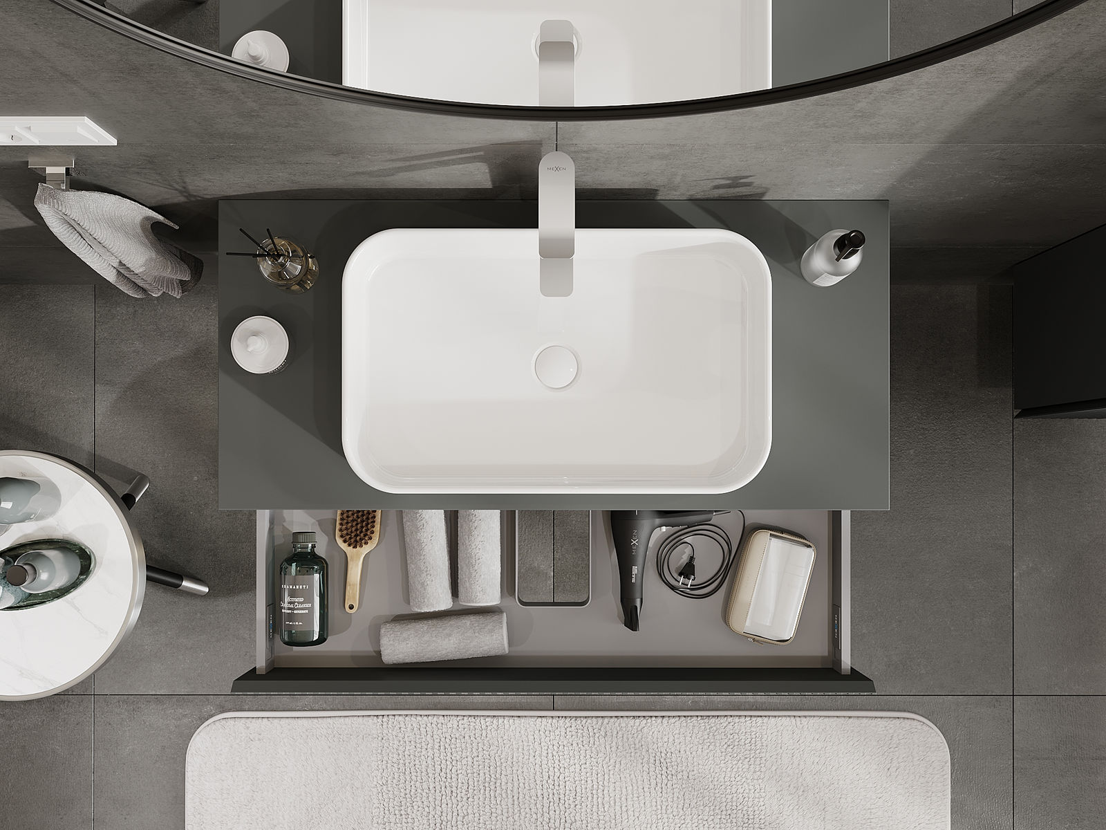 A fiókban lévő kivágás úgy van kialakítva, hogy befogadja a mosdó telepítéseknél szükséges szifont. Ennek köszönhetően a bútor teljesen funkcionálisan felszerelhető anélkül, hogy a fiók terének egy részét fel kellene áldozni a telepítés miatt.