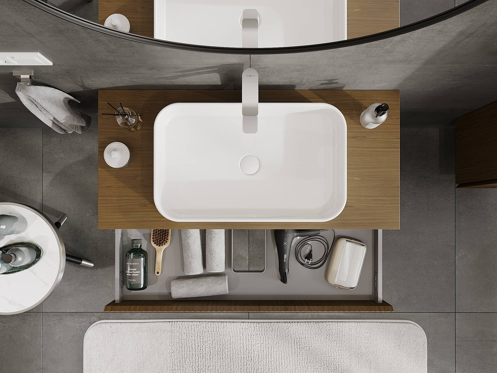 A fiókban lévő kivágás úgy van kialakítva, hogy befogadja a mosdó telepítéseknél szükséges szifont. Ennek köszönhetően a bútor teljesen funkcionálisan felszerelhető anélkül, hogy a fiók terének egy részét fel kellene áldozni a telepítés miatt.