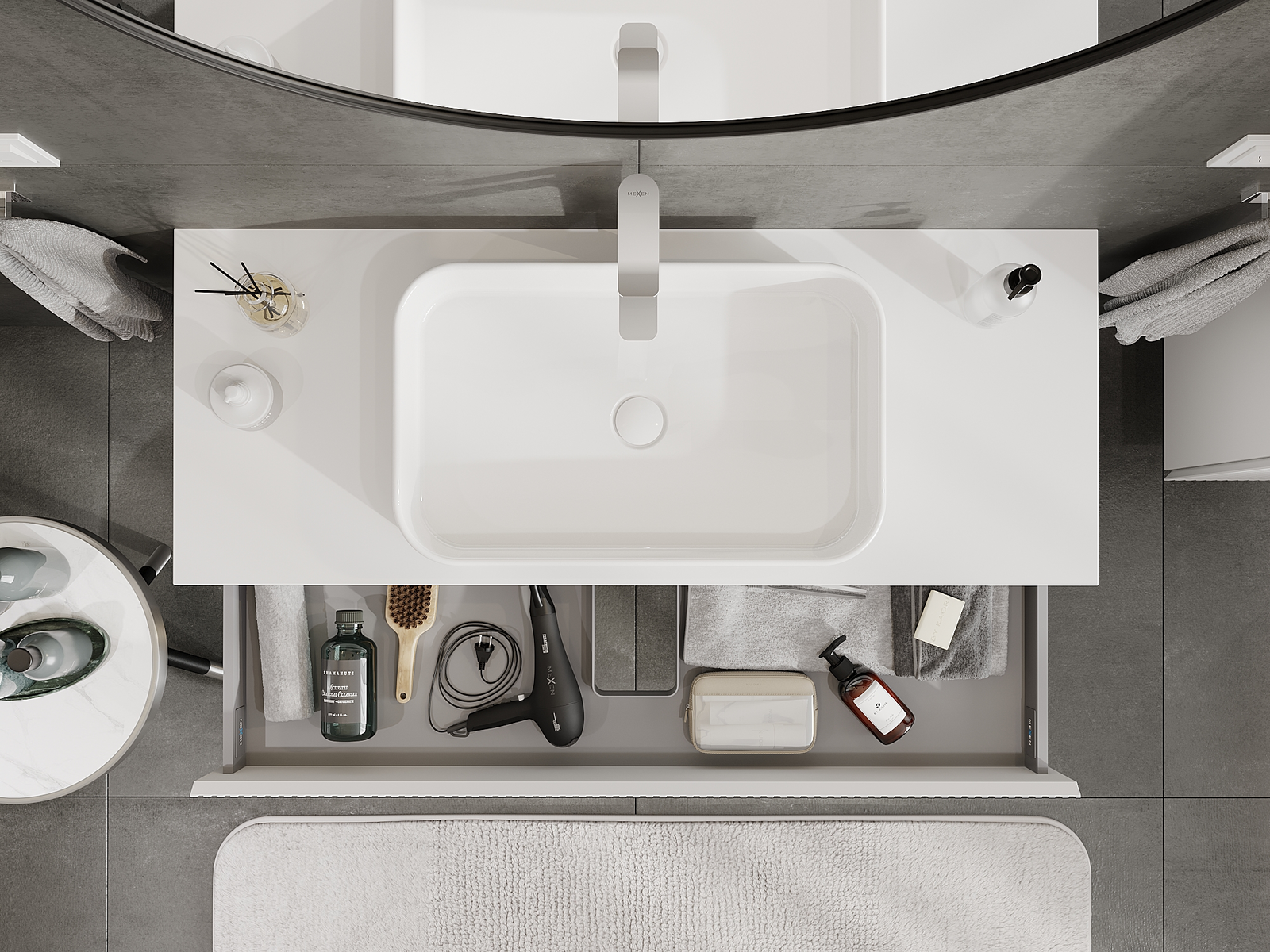 A fiókban lévő kivágás úgy van kialakítva, hogy befogadja a mosdó telepítéseknél szükséges szifont. Ennek köszönhetően a bútor teljesen funkcionálisan felszerelhető anélkül, hogy a fiók terének egy részét fel kellene áldozni a telepítés miatt.