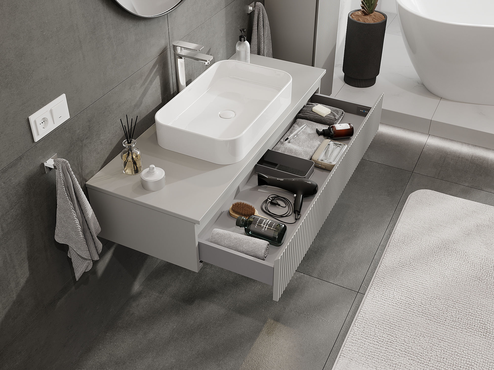 Mexen Rivel 120 cm-es fürdőszobai mosdószekrény, 1 fiók, bordázott, szürke matt - 91A20-12023-1-BF62
