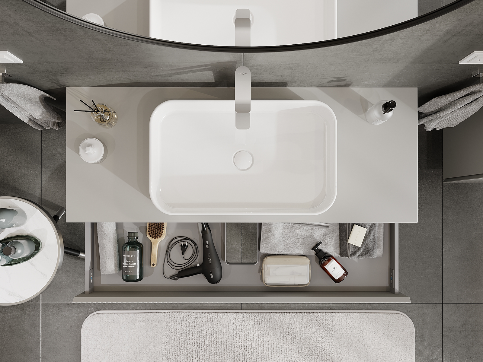 A fiókban lévő kivágás úgy van kialakítva, hogy befogadja a mosdó telepítéseknél szükséges szifont. Ennek köszönhetően a bútor teljesen funkcionálisan felszerelhető anélkül, hogy a fiók terének egy részét fel kellene áldozni a telepítés miatt.