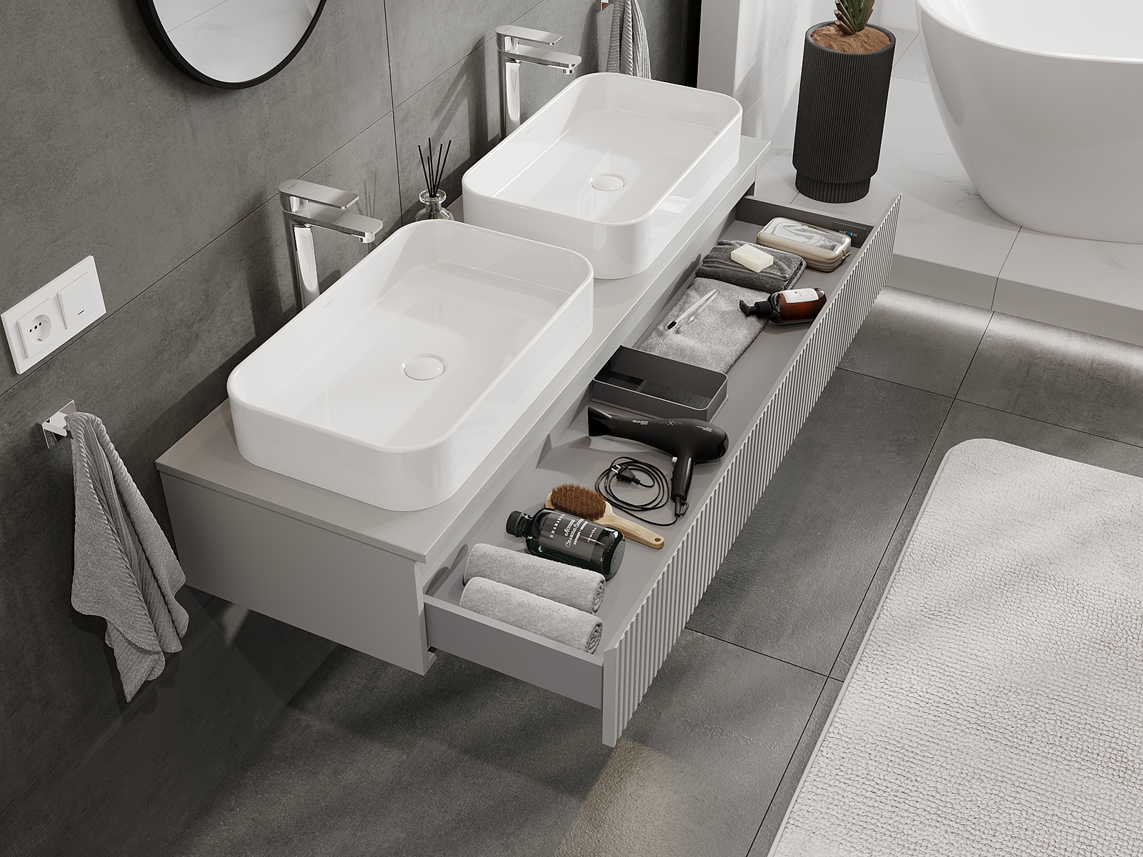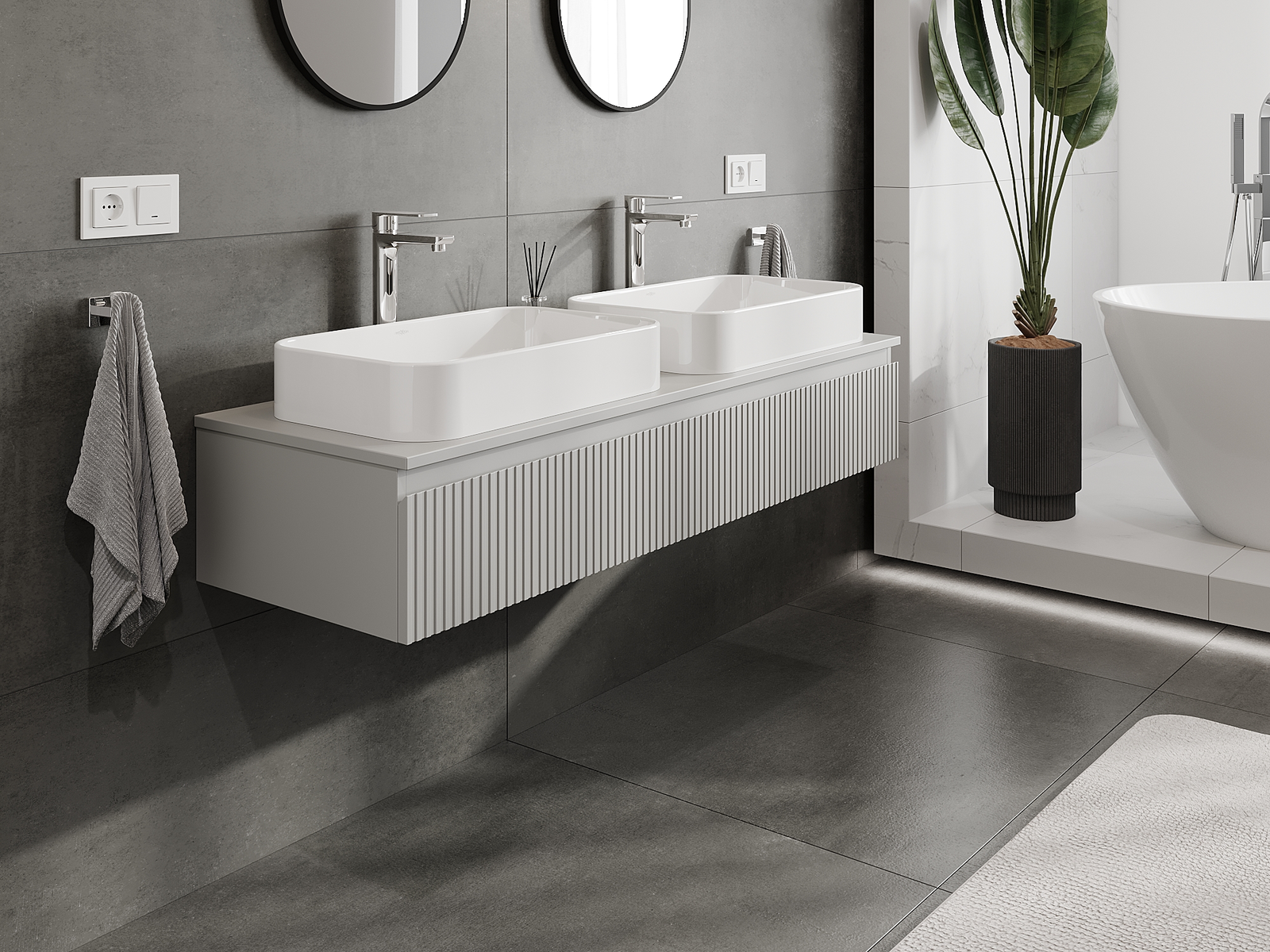 A moduláris fürdőszobabútorainkat különböző színkonfigurációkban lehet kombinálni, lehetővé téve a teljes személyre szabást. Kiválasztható mind az egyes elemek megjelenése, mind pedig funkciói, ami lehetővé teszi a bútorok személyes stílus- és használati preferenciákhoz való igazítását.