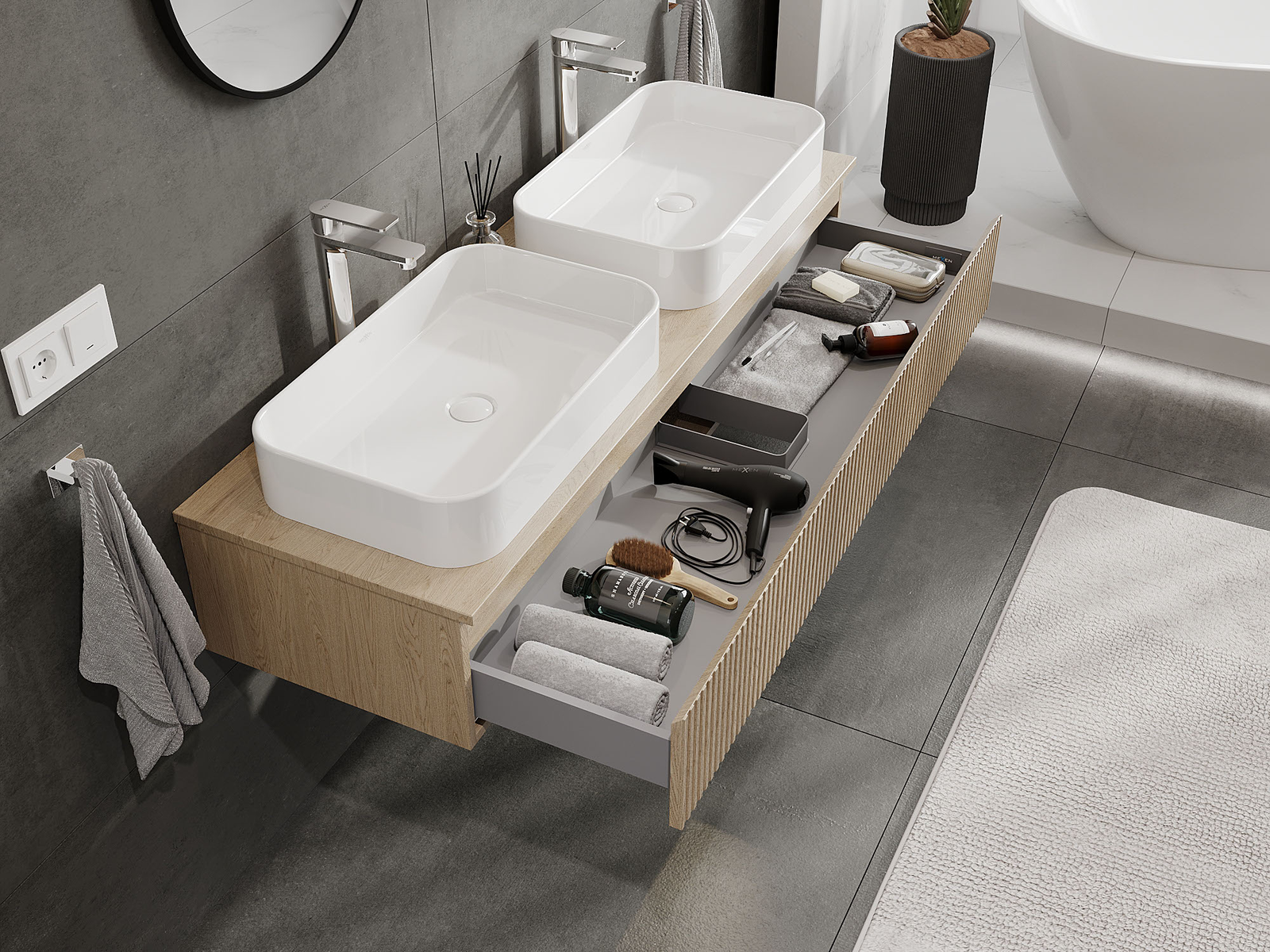 A fiókban lévő kivágás úgy van kialakítva, hogy befogadja a mosdó telepítéseknél szükséges szifont. Ennek köszönhetően a bútor teljesen funkcionálisan felszerelhető anélkül, hogy a fiók terének egy részét fel kellene áldozni a telepítés miatt.