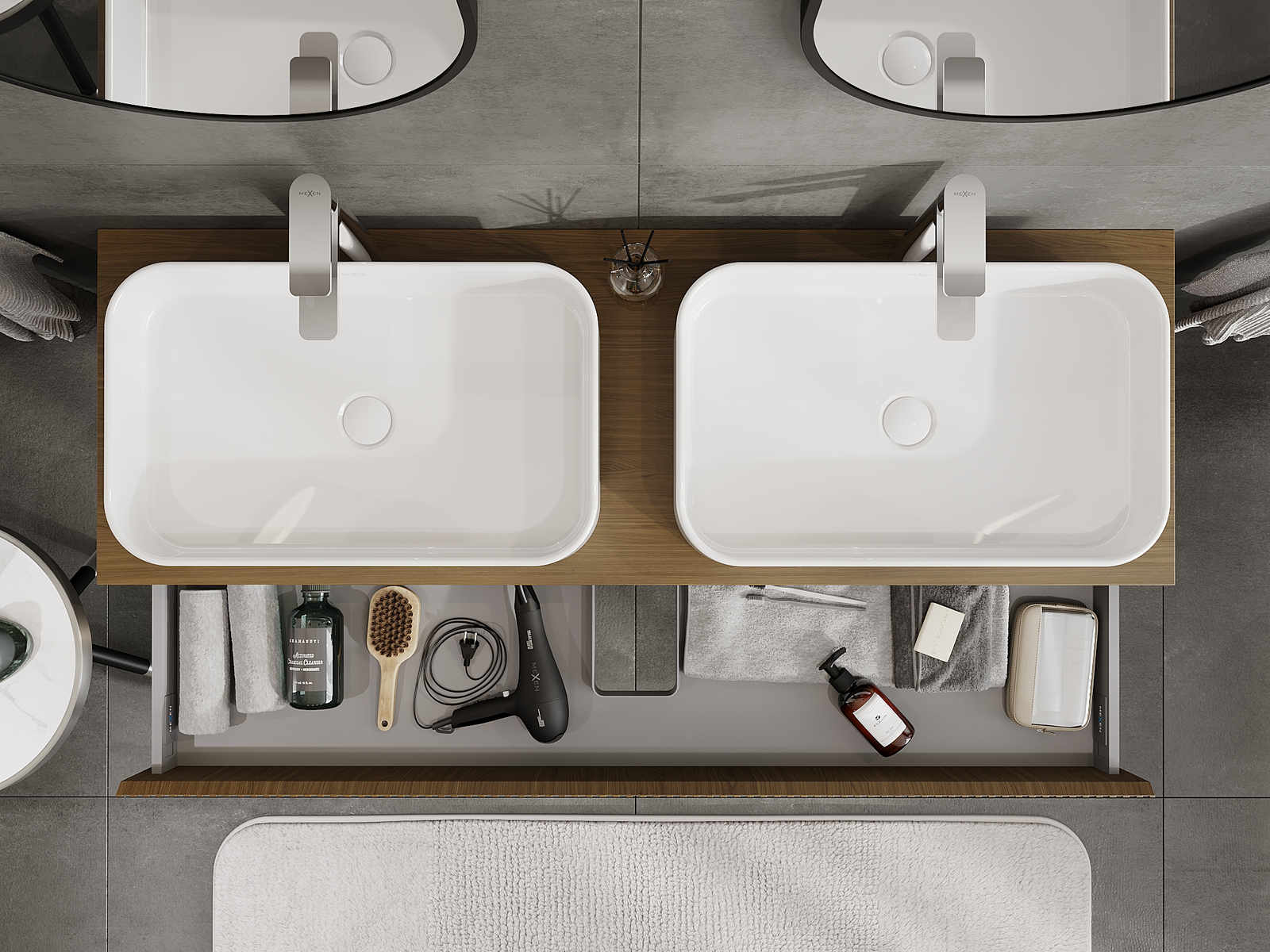 A fiókban lévő kivágás úgy van kialakítva, hogy befogadja a mosdó telepítéseknél szükséges szifont. Ennek köszönhetően a bútor teljesen funkcionálisan felszerelhető anélkül, hogy a fiók terének egy részét fel kellene áldozni a telepítés miatt.