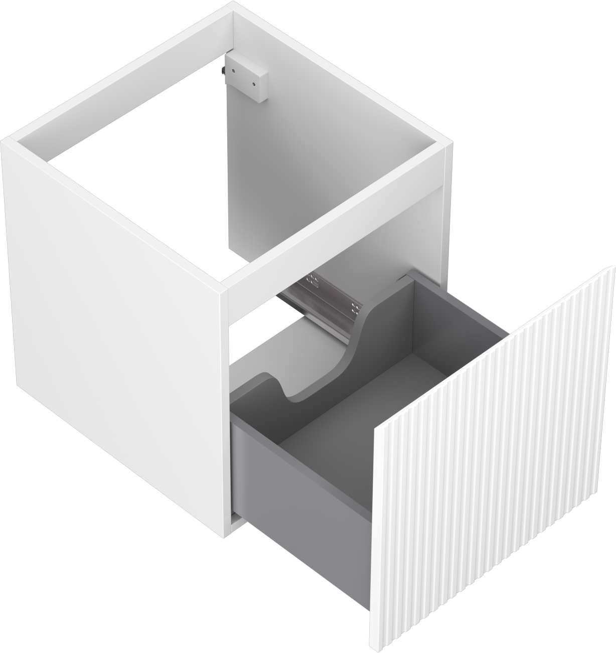 A fiókban lévő kivágás úgy van kialakítva, hogy befogadja a mosdó telepítéseknél szükséges szifont. Ennek köszönhetően a bútor teljesen funkcionálisan felszerelhető anélkül, hogy a fiók terének egy részét fel kellene áldozni a telepítés miatt.