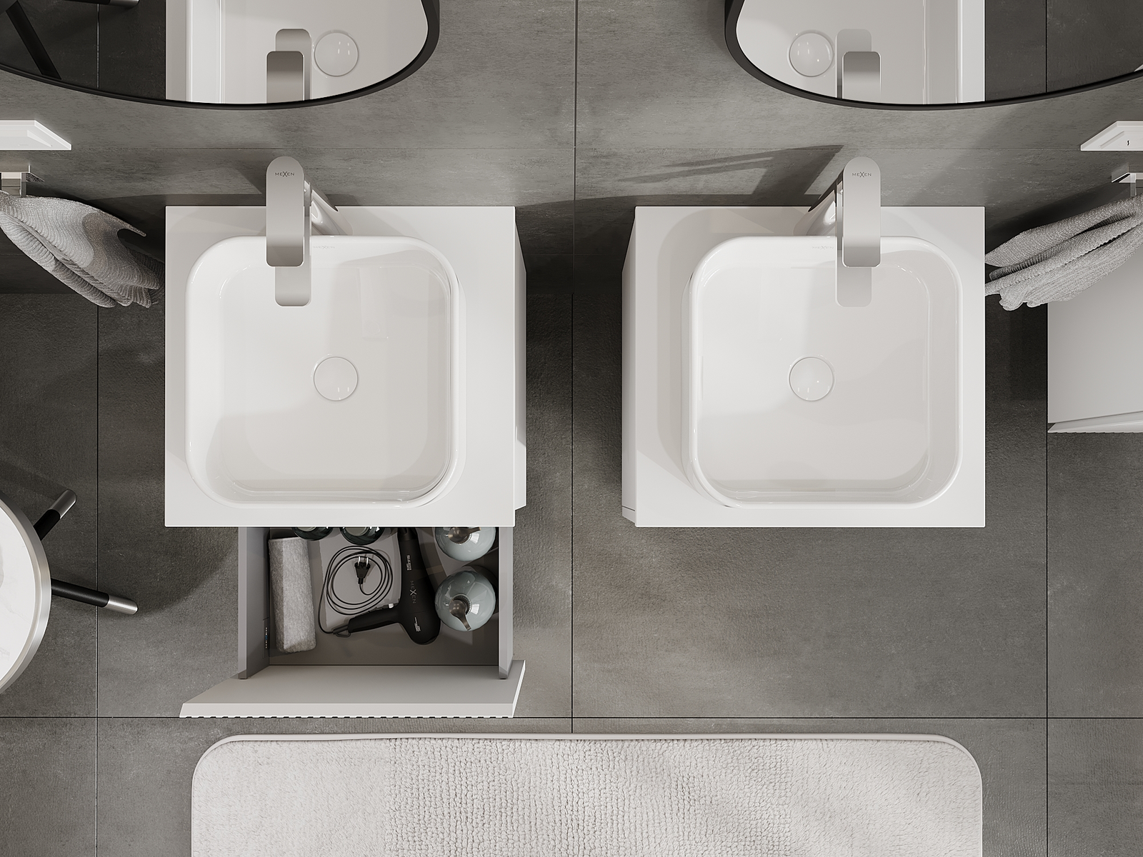 A fiókban lévő kivágás úgy van kialakítva, hogy befogadja a mosdó telepítéseknél szükséges szifont. Ennek köszönhetően a bútor teljesen funkcionálisan felszerelhető anélkül, hogy a fiók terének egy részét fel kellene áldozni a telepítés miatt.