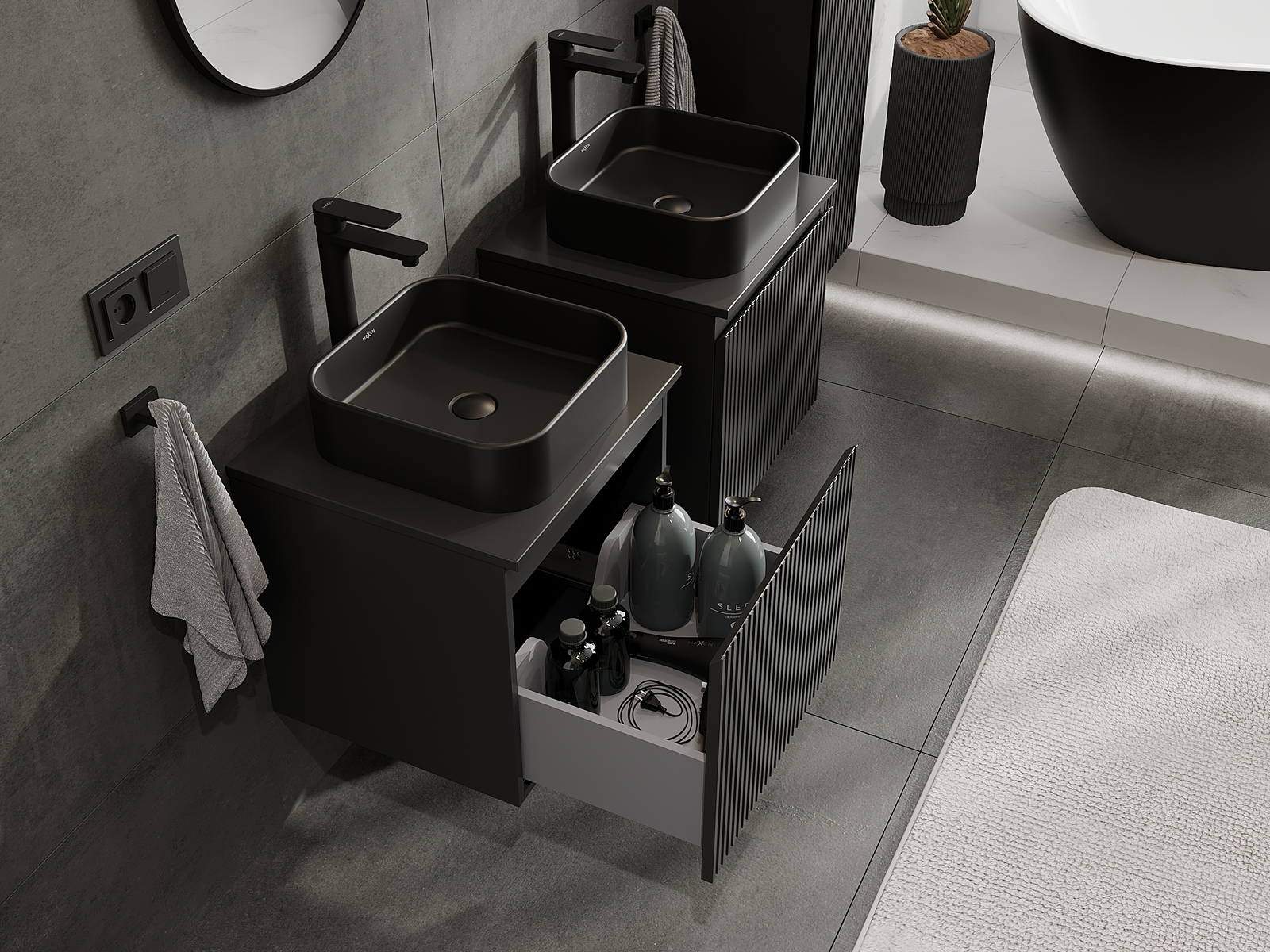 A moduláris fürdőszobabútorainkat különböző színkonfigurációkban lehet kombinálni, lehetővé téve a teljes személyre szabást. Kiválasztható mind az egyes elemek megjelenése, mind pedig funkciói, ami lehetővé teszi a bútorok személyes stílus- és használati preferenciákhoz való igazítását.