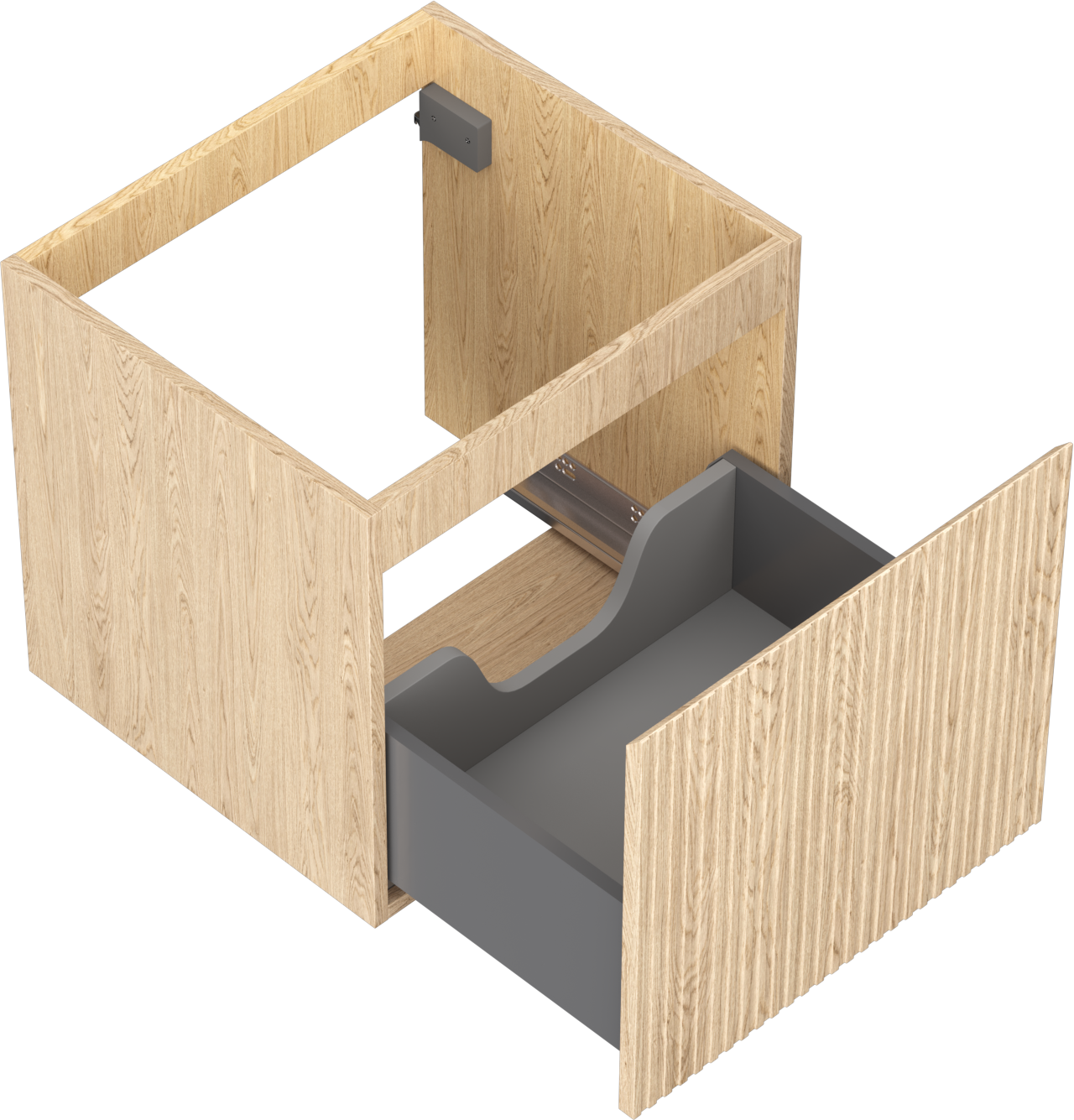 A fiókban lévő kivágás úgy van kialakítva, hogy befogadja a mosdó telepítéseknél szükséges szifont. Ennek köszönhetően a bútor teljesen funkcionálisan felszerelhető anélkül, hogy a fiók terének egy részét fel kellene áldozni a telepítés miatt.