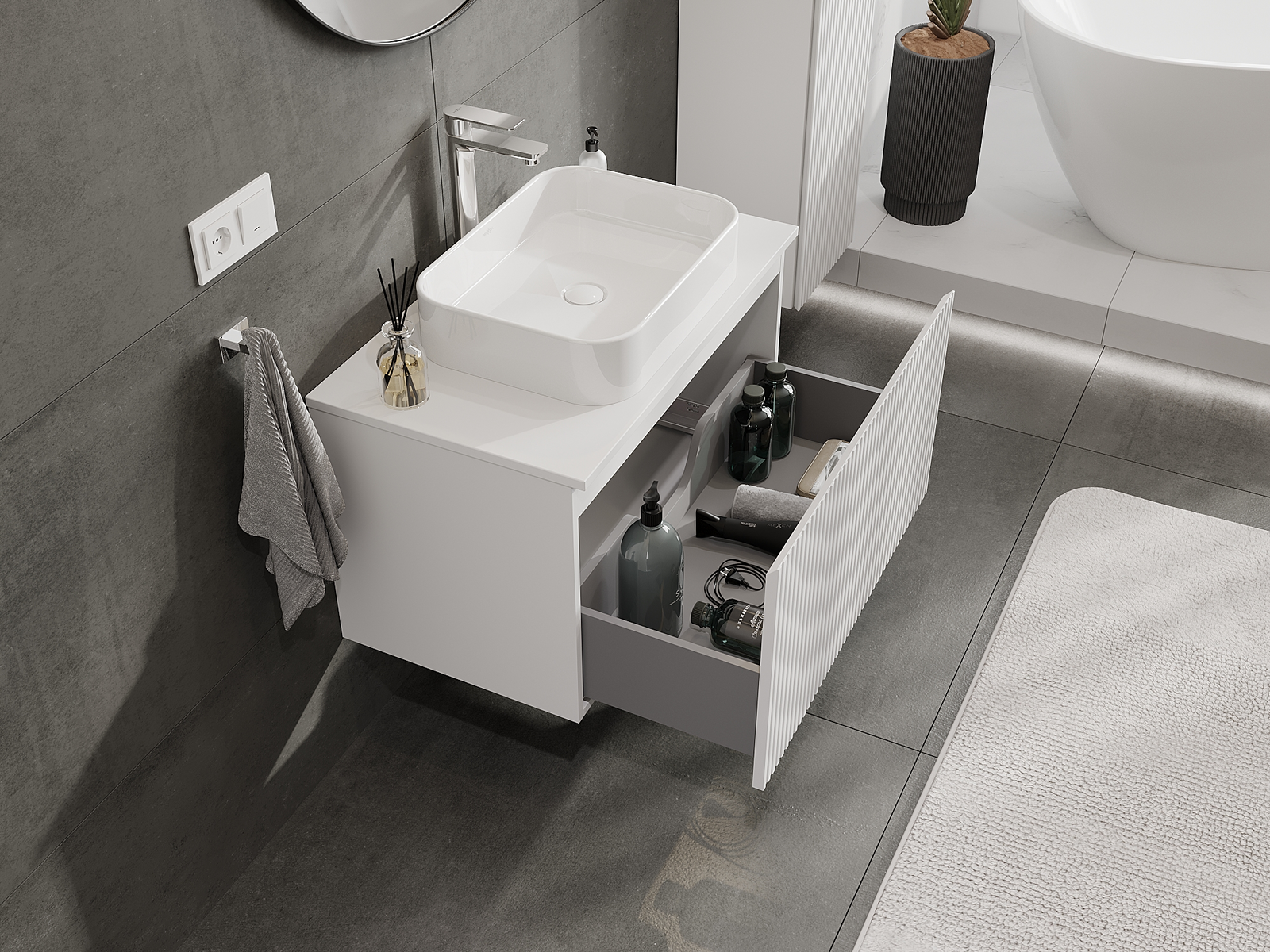 A fiókban lévő kivágás úgy van kialakítva, hogy befogadja a mosdó telepítéseknél szükséges szifont. Ennek köszönhetően a bútor teljesen funkcionálisan felszerelhető anélkül, hogy a fiók terének egy részét fel kellene áldozni a telepítés miatt.