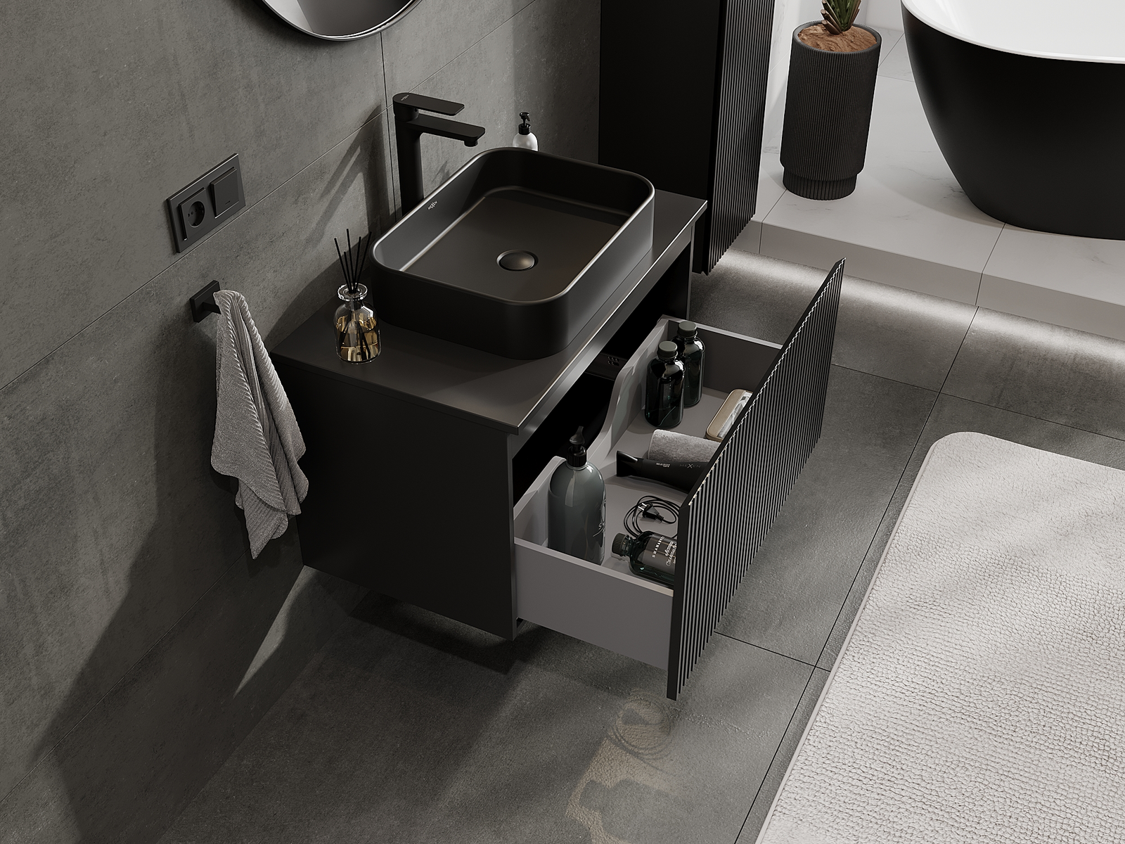 A fiókban lévő kivágás úgy van kialakítva, hogy befogadja a mosdó telepítéseknél szükséges szifont. Ennek köszönhetően a bútor teljesen funkcionálisan felszerelhető anélkül, hogy a fiók terének egy részét fel kellene áldozni a telepítés miatt.