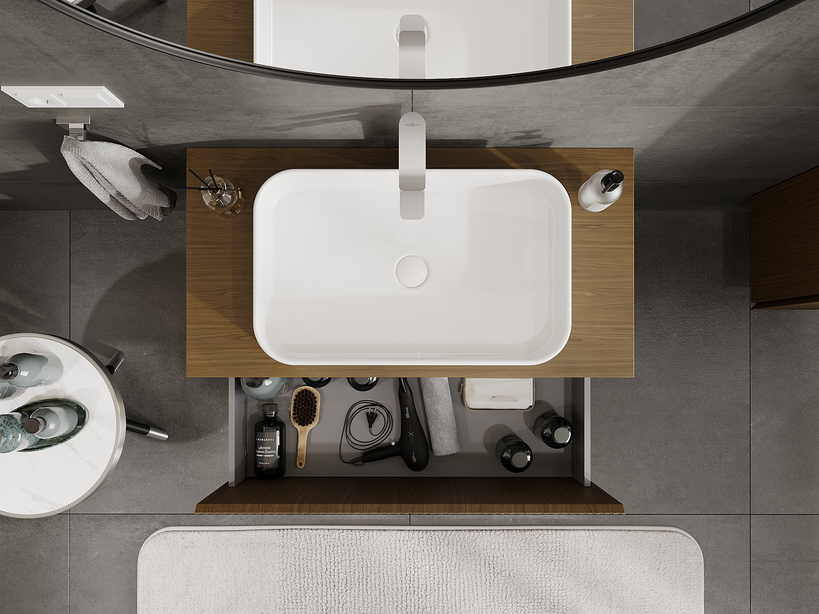A fiókban lévő kivágás úgy van kialakítva, hogy befogadja a mosdó telepítéseknél szükséges szifont. Ennek köszönhetően a bútor teljesen funkcionálisan felszerelhető anélkül, hogy a fiók terének egy részét fel kellene áldozni a telepítés miatt.