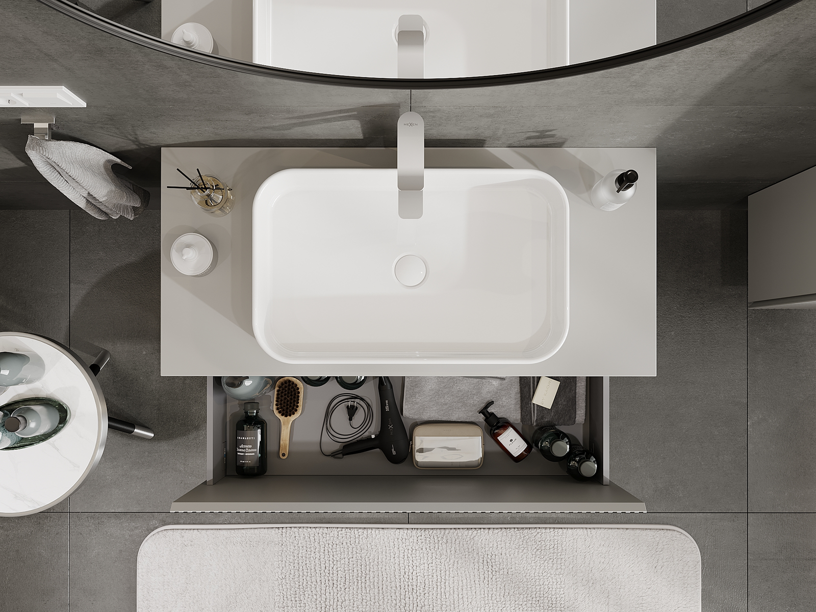A fiókban lévő kivágás úgy van kialakítva, hogy befogadja a mosdó telepítéseknél szükséges szifont. Ennek köszönhetően a bútor teljesen funkcionálisan felszerelhető anélkül, hogy a fiók terének egy részét fel kellene áldozni a telepítés miatt.